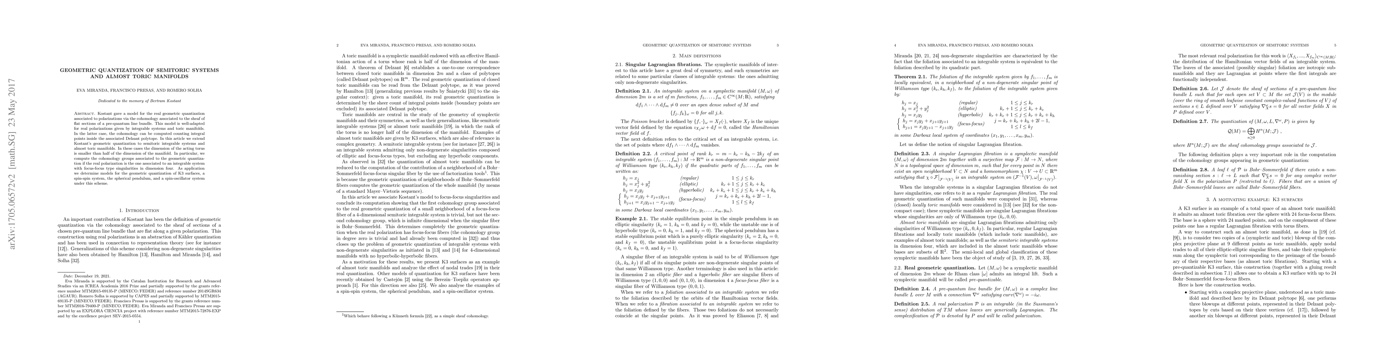 This paper extends Kostant's geometric quantization to semitoric systems and almost toric manifolds, enabling computation of cohomology groups for integrable systems with focus-focus type singularities in dimension four.