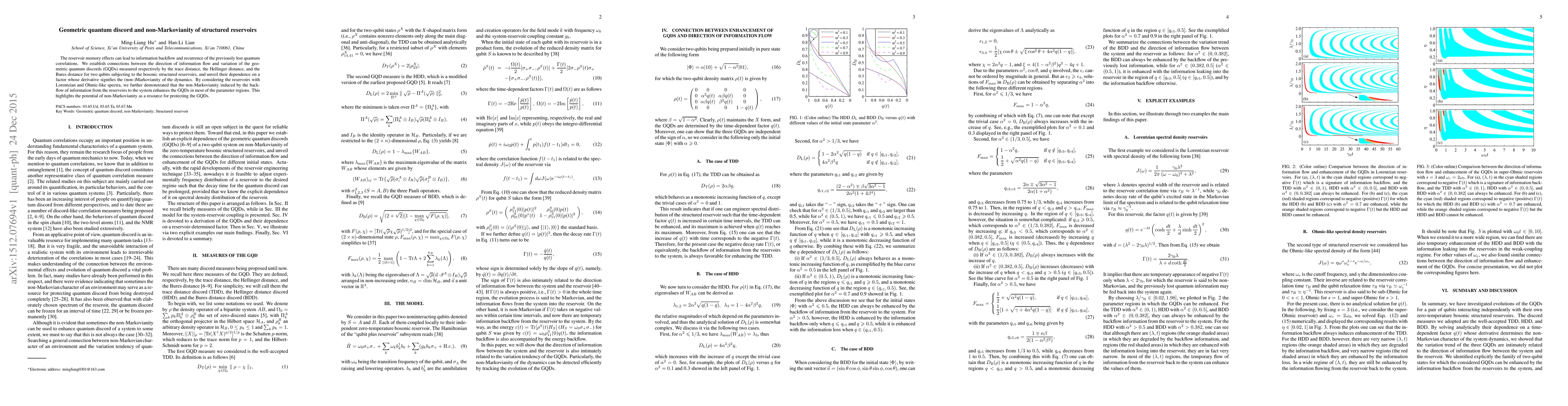 This paper explores how memory effects in structured reservoirs can lead to information backflow and the recurrence of quantum correlations. It connects the direction of information flow to variations in geometric quantum discords, showing that non-Markovianity enhances these discords, thus highlighting non-Markovianity as a resource for protecting quantum correlations.