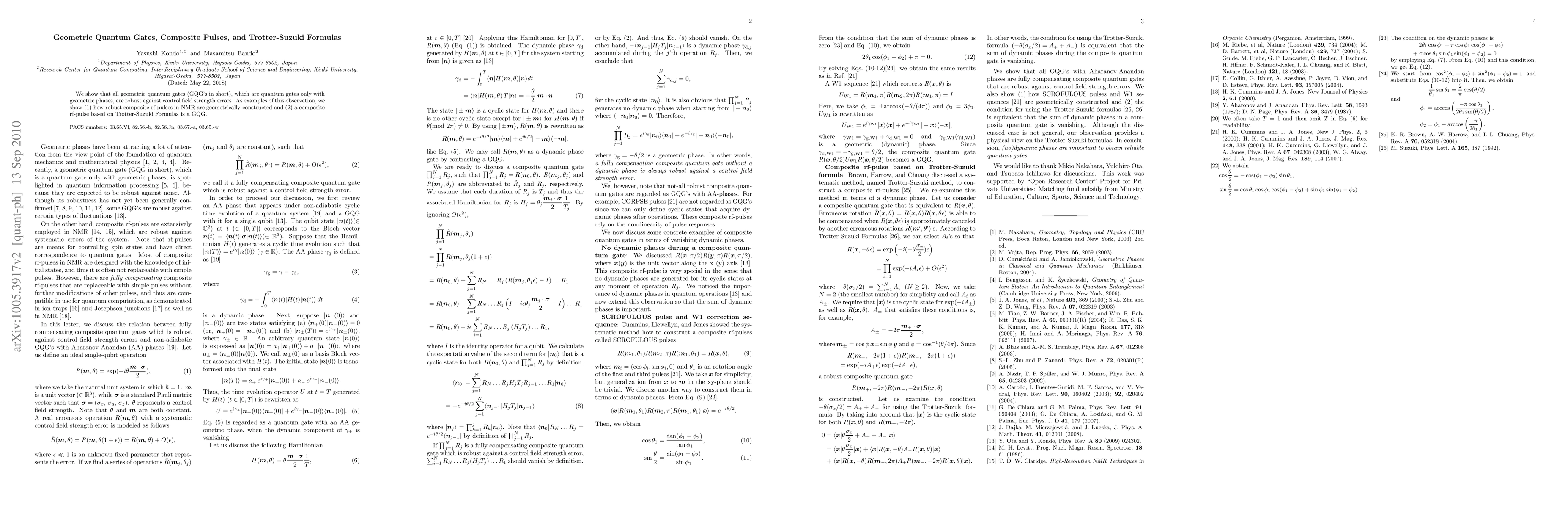 This research demonstrates that geometric quantum gates, which rely solely on geometric phases, are resilient to control field strength errors. It provides examples of robust composite NMR rf-pulses constructed geometrically and shows that a composite rf-pulse derived from Trotter-Suzuki Formulas is also a geometric quantum gate.