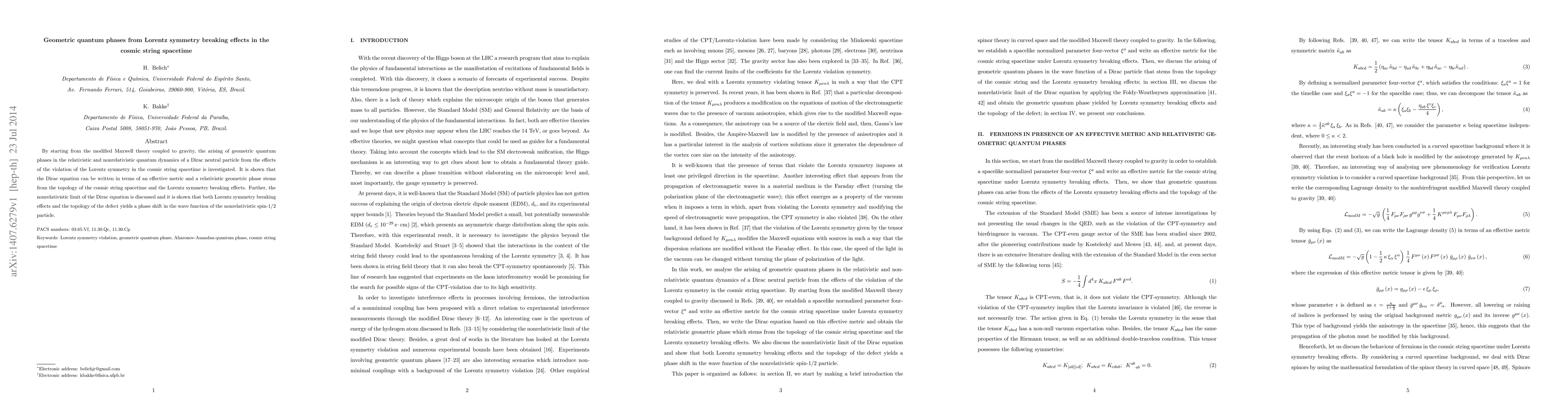 This paper investigates how Lorentz symmetry breaking in cosmic string spacetime leads to geometric quantum phases in both relativistic and nonrelativistic dynamics of a Dirac neutral particle. It demonstrates that the Dirac equation can be expressed in terms of an effective metric, revealing a relativistic geometric phase from cosmic string topology and symmetry breaking, and a phase shift in the wave function for nonrelativistic particles.