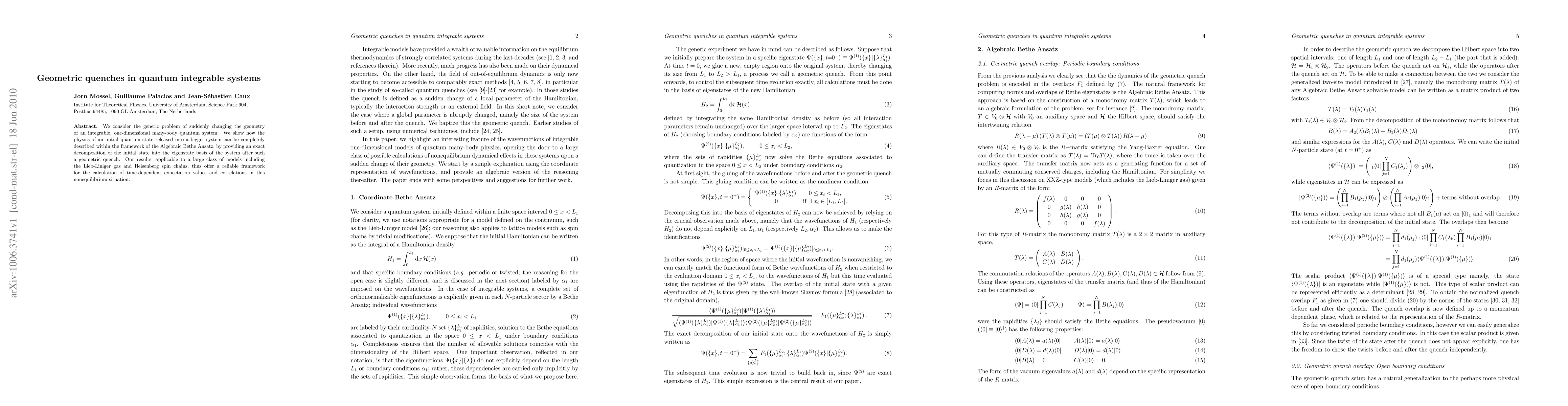 Researchers developed a framework to describe how a quantum system's initial state changes when its geometry is suddenly altered, using the Algebraic Bethe Ansatz. This allows for accurate calculation of time-dependent expectation values and correlations in nonequilibrium situations.
