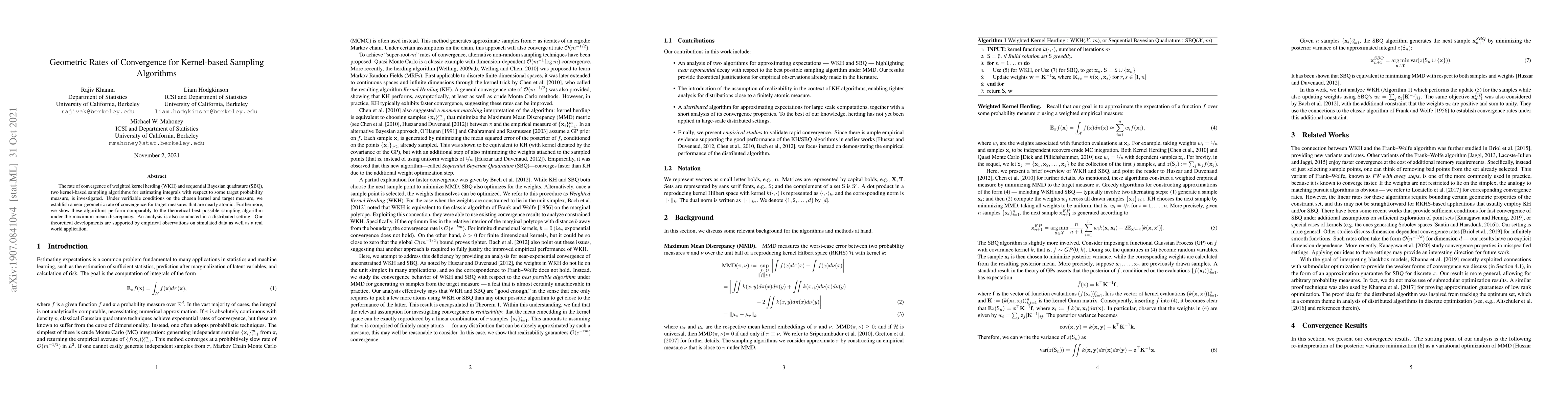 This paper investigates the convergence rates of kernel-based sampling algorithms, WKH and SBQ, for estimating integrals. It establishes near-geometric convergence rates under specific conditions and shows their performance is comparable to the best possible algorithm. Theoretical findings are validated through simulations and a real-world application.
