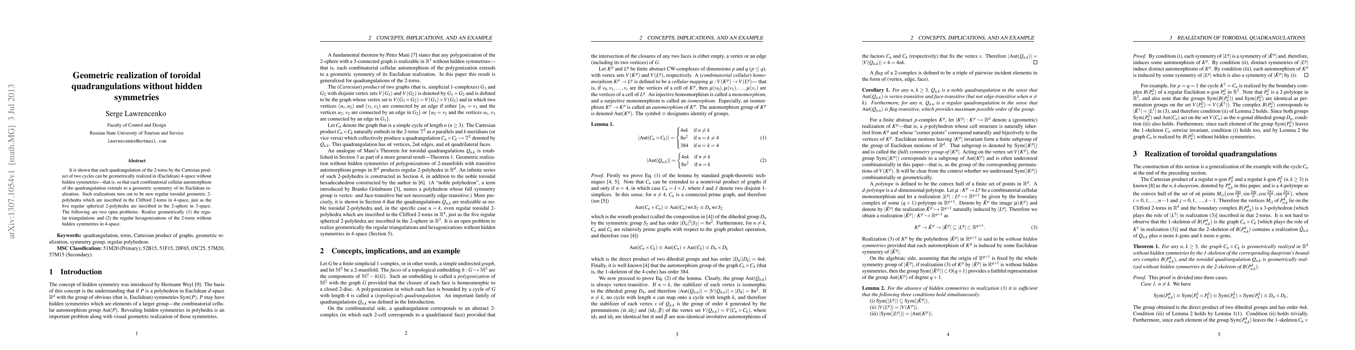 This research demonstrates that every quadrangulation of a 2-torus can be geometrically realized in 4-space without hidden symmetries, creating new regular toroidal geometric 2-polyhedra inscribed in a Clifford 2-torus, similar to how regular spherical 2-polyhedra are inscribed in a 2-sphere. The paper also poses two open problems regarding the geometric realization of regular triangulations and hexagonizations of the 2-torus in 4-space without hidden symmetries.