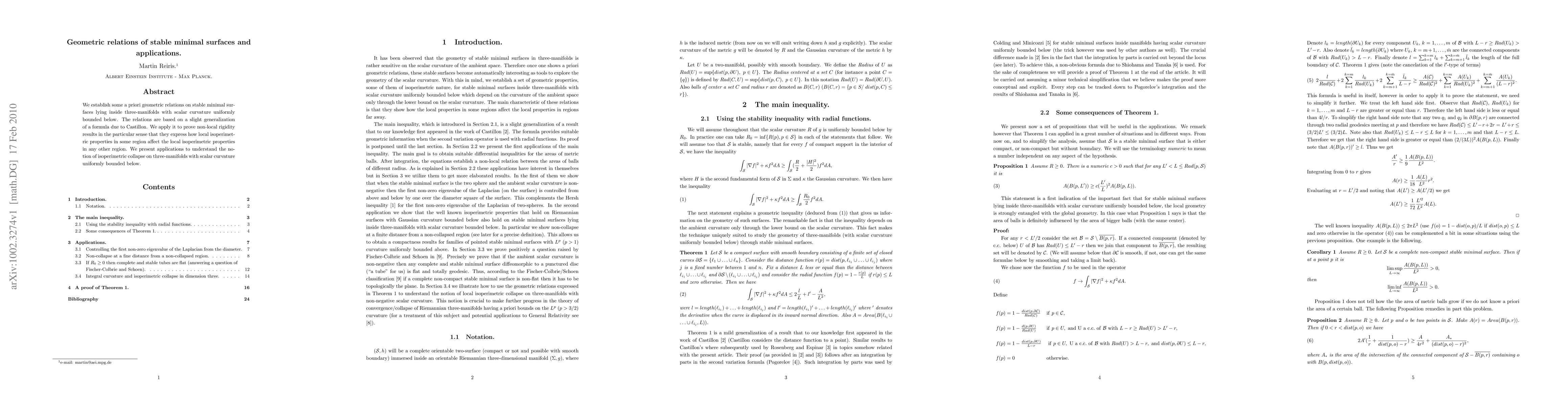 We establish some a priori geometric relations on stable minimal surfaces lying inside three-manifolds with scalar curvature uniformly bounded below. The relations are based on a slight generalization of a formula due to Castillon. We apply it to prove non-local rigidity results in the particular sense that they express how local isoperimetric properties in some region affect the local isoperimetric properties in any other region. We present applications to understand the notion of isoperimetric collapse on three-manifolds with scalar curvature uniformly bounded below.