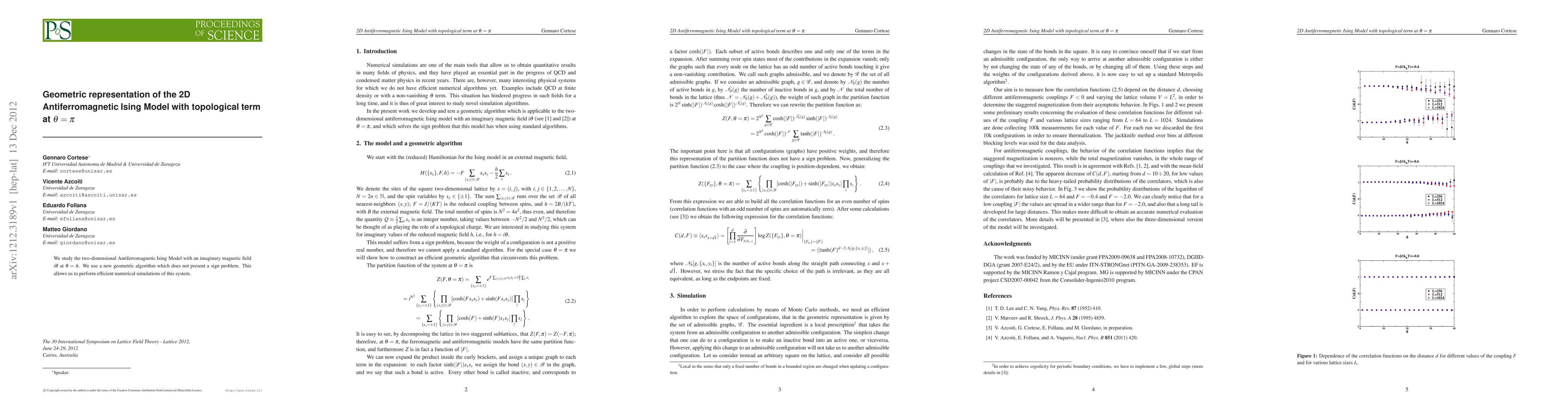 We study the two-dimensional Antiferromagnetic Ising Model with an imaginary magnetic field i\theta at \theta=\pi. We use a new geometric algorithm which does not present a sign problem. This allows us to perform efficient numerical simulations of this system.