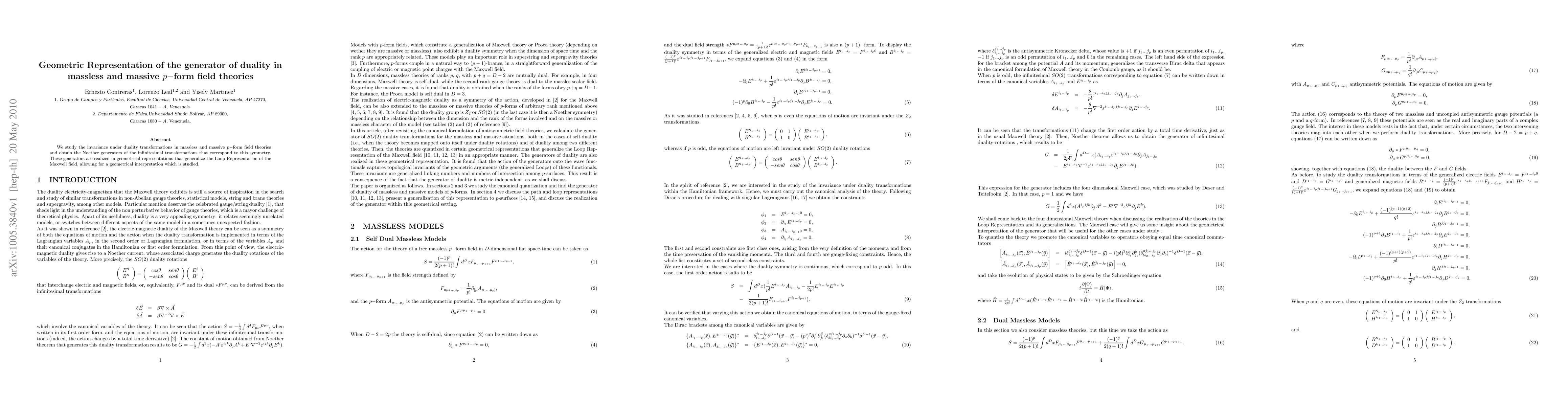 This paper investigates the invariance under duality transformations in both massless and massive $p-$form field theories, deriving the Noether generators for these symmetries. It presents a geometric representation that extends the Loop Representation, offering a new geometrical interpretation of the duality transformations.
