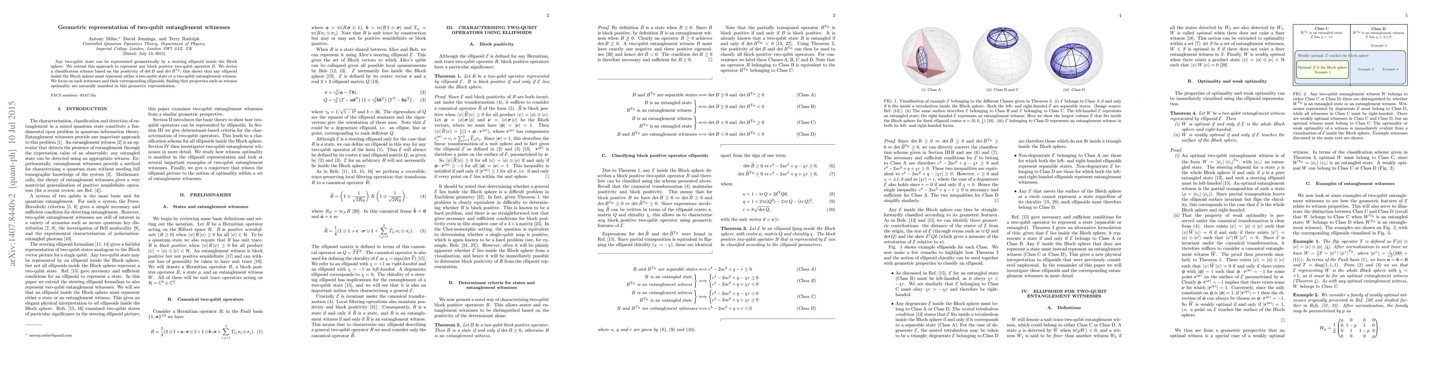 Any two-qubit state can be represented geometrically by a steering ellipsoid inside the Bloch sphere. We extend this approach to represent any block positive two-qubit operator $B$. We derive a novel classification scheme based on the positivity of $\det B$ and $\det B^\mathrm{T_B}$; this shows that any ellipsoid inside the Bloch sphere must represent either a two-qubit state or a two-qubit entanglement witness. We focus on such witnesses and their corresponding ellipsoids, finding that properties such as witness optimality are naturally manifest in this geometric representation.