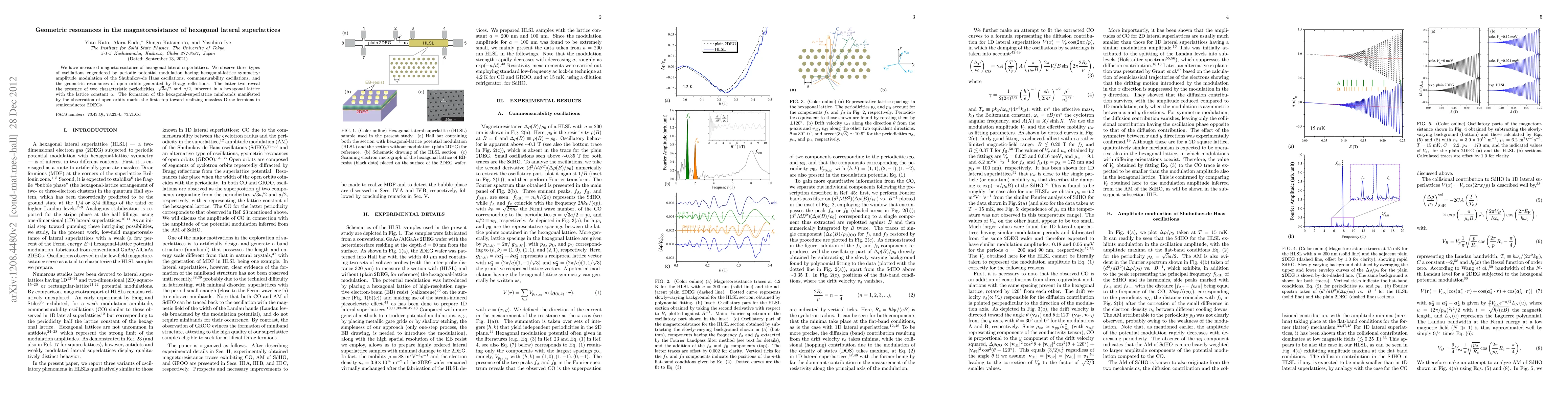 This study measures the magnetoresistance of hexagonal lateral superlattices, identifying three oscillation types: amplitude modulation of Shubnikov-de Haas oscillations, commensurability oscillations, and geometric resonances from open orbits. These resonances reveal inherent periodicities in the hexagonal lattice, indicating the formation of minibands and paving the way for massless Dirac fermions in semiconductor 2DEGs.