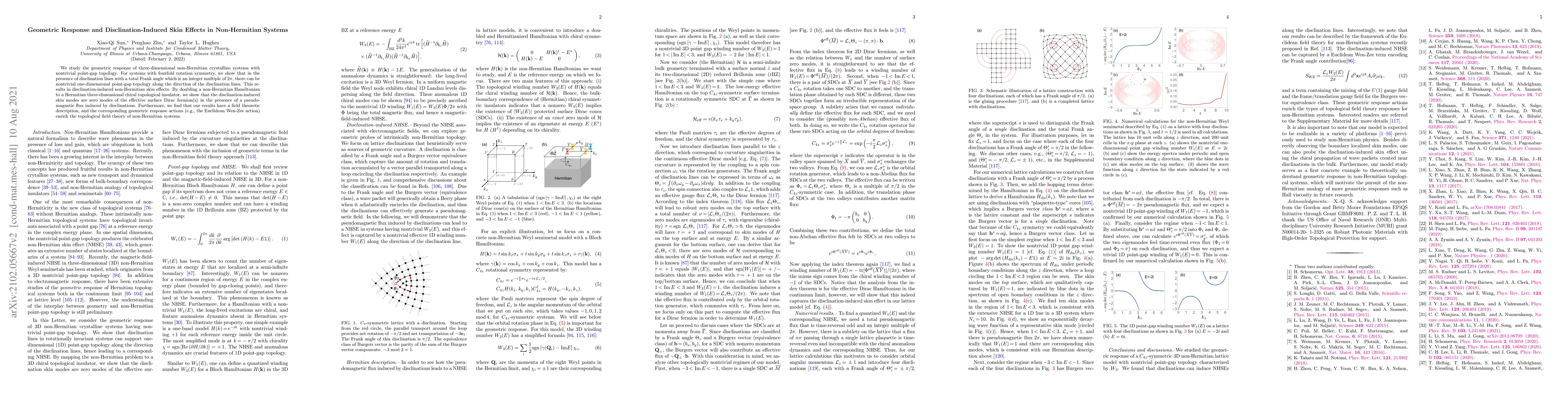 We study the geometric response of three-dimensional non-Hermitian crystalline systems with nontrivial point-gap topology. For systems with fourfold rotation symmetry, we show that in the presence of disclination lines with a total Frank angle which is an integer multiple of $2\pi$, there can be nontrivial one-dimensional point-gap topology along the direction of the disclination lines. This results in disclination-induced non-Hermitian skin effects. By doubling a non-Hermitian Hamiltonian to a Hermitian three-dimensional chiral topological insulator, we show that the disclination-induced skin modes are zero modes of the effective surface Dirac fermion(s) in the presence of a pseudomagnetic flux induced by disclinations. Furthermore, we find that our results have a field theoretic description, and the corresponding geometric response actions (e.g., the Euclidean Wen-Zee action) enrich the topological field theory of non-Hermitian systems.