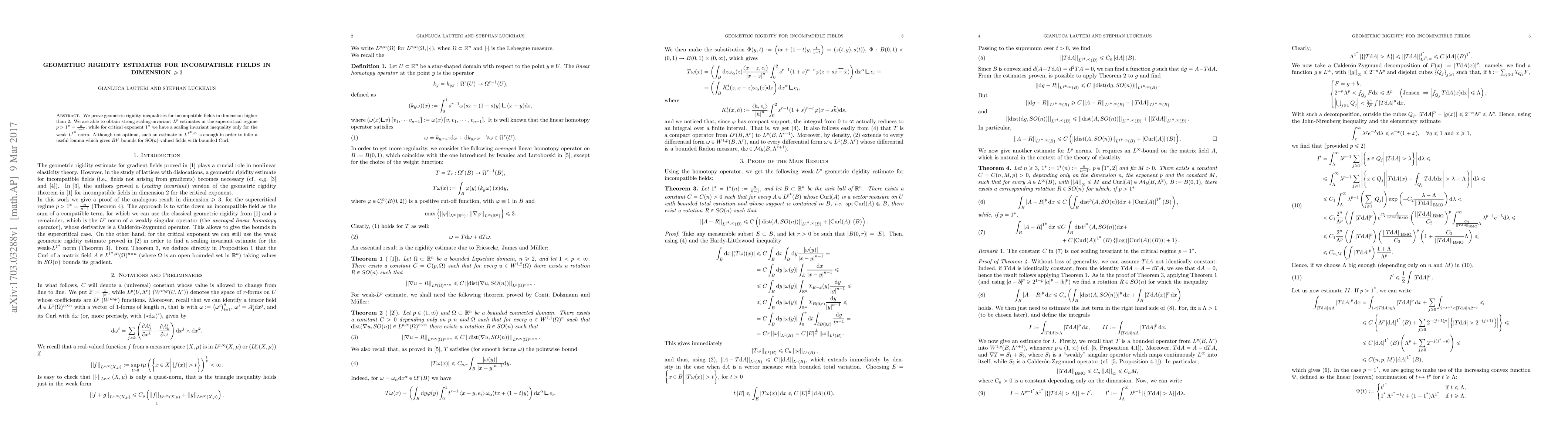 This paper establishes geometric rigidity inequalities for incompatible fields in dimensions greater than 2, providing strong scaling-invariant $L^p$ estimates in the supercritical regime. For the critical exponent, it offers a scaling invariant inequality in the weak-$L^1$ norm, leading to $BV$ bounds for $SO(n)$-valued fields with bounded Curl.