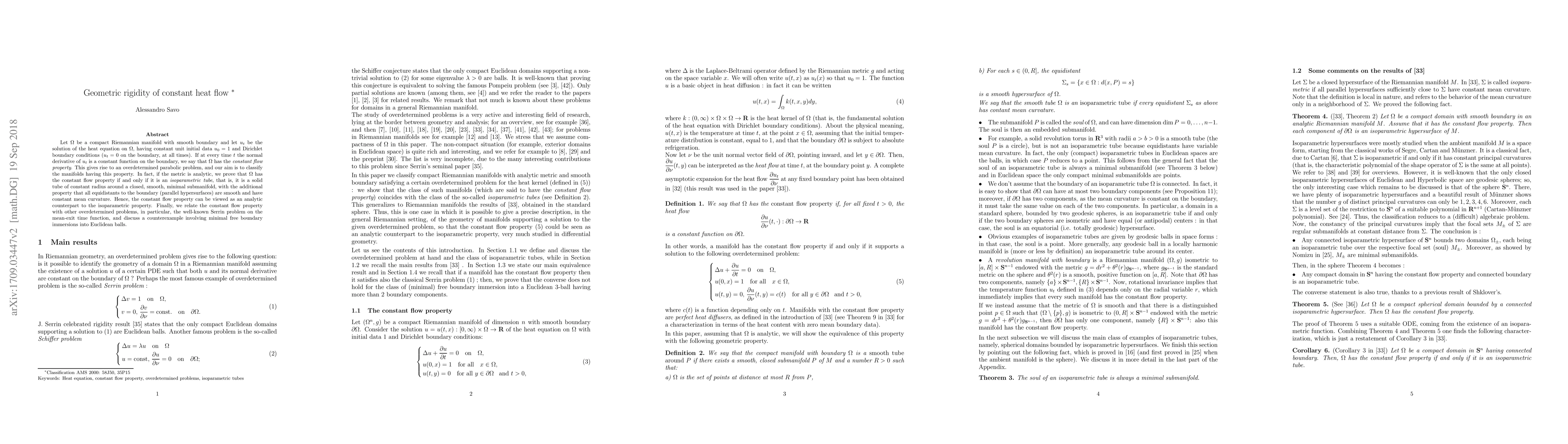 Let $\Omega$ be a compact Riemannian manifold with smooth boundary and let $u_t$ be the solution of the heat equation on $\Omega$, having constant unit initial data $u_0=1$ and Dirichlet boundary conditions ($u_t=0$ on the boundary, at all times). If at every time $t$ the normal derivative of $u_t$ is a constant function on the boundary, we say that $\Omega$ has the {\it constant flow property}. This gives rise to an overdetermined parabolic problem, and our aim is to classify the manifolds having this property. In fact, if the metric is analytic, we prove that $\Omega$ has the constant flow property if and only if it is an {\it isoparametric tube}, that is, it is a solid tube of constant radius around a closed, smooth, minimal submanifold, with the additional property that all equidistants to the boundary (parallel hypersurfaces) are smooth and have constant mean curvature. Hence, the constant flow property can be viewed as an analytic counterpart to the isoparametric property. Finally, we relate the constant flow property with other overdetermined problems, in particular, the well-known Serrin problem on the mean-exit time function, and discuss a counterexample involving minimal free boundary immersions into Euclidean balls.