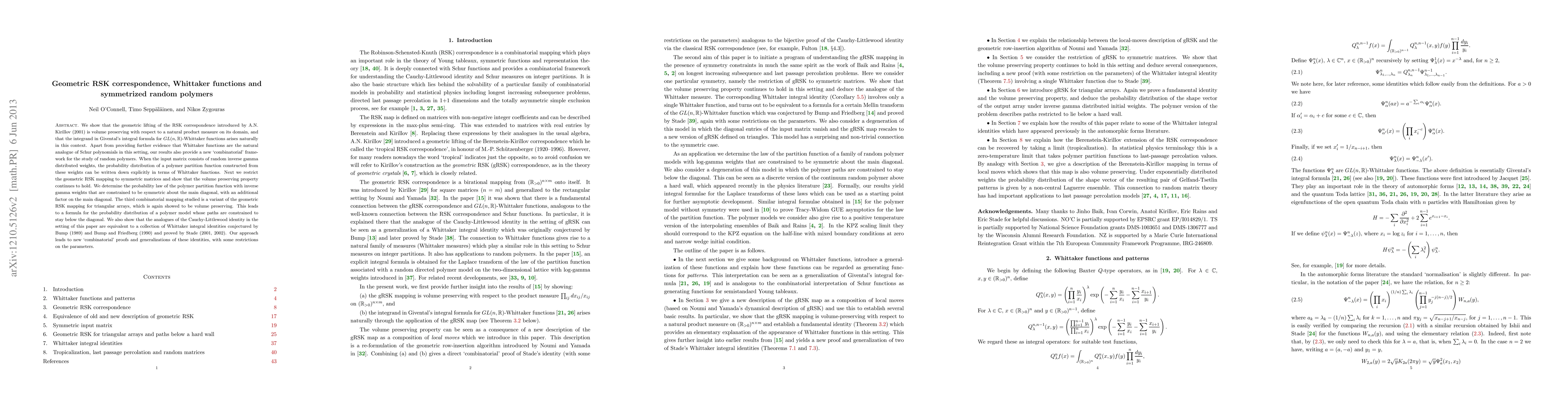 This paper demonstrates that the geometric RSK correspondence preserves volume and links Whittaker functions to Schur polynomials in a new combinatorial framework for random polymers. It explicitly expresses polymer partition functions using Whittaker functions for random inverse gamma distributed weights and establishes volume preservation for symmetric and triangular array variants.