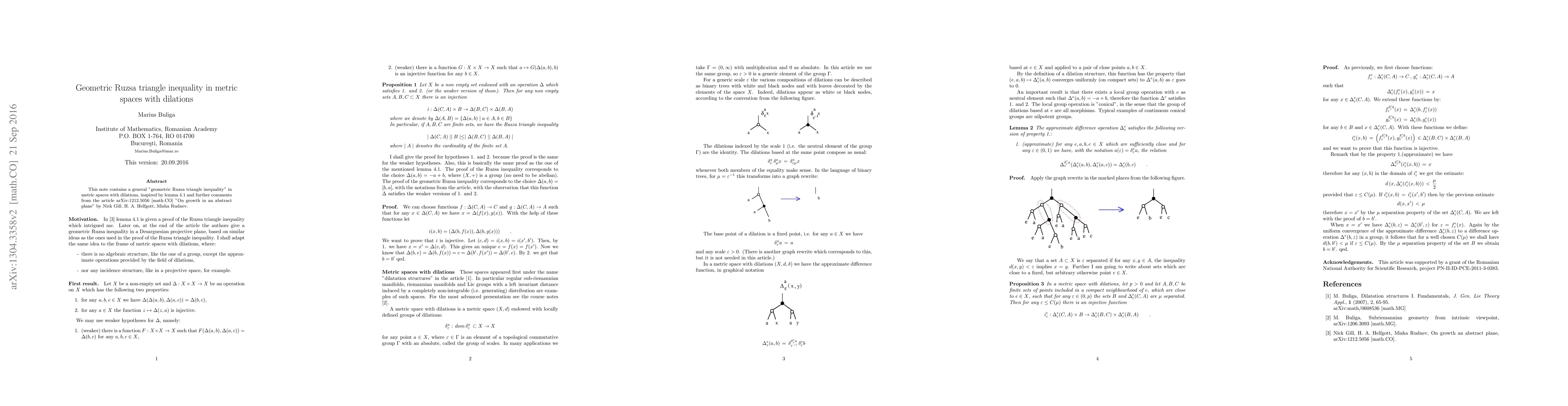 The Appendix of the article arXiv:1212.5056 [math.CO] "On growth in an abstract plane" by Nick Gill, H. A. Helfgott, Misha Rudnev, contains a general "geometric Ruzsa triangle inequality" in a Desarguesian projective plane. The purpose of this note is to give a similar inequality for metric spaces with dilations, that is in the absence of an algebraic or incidence structure.