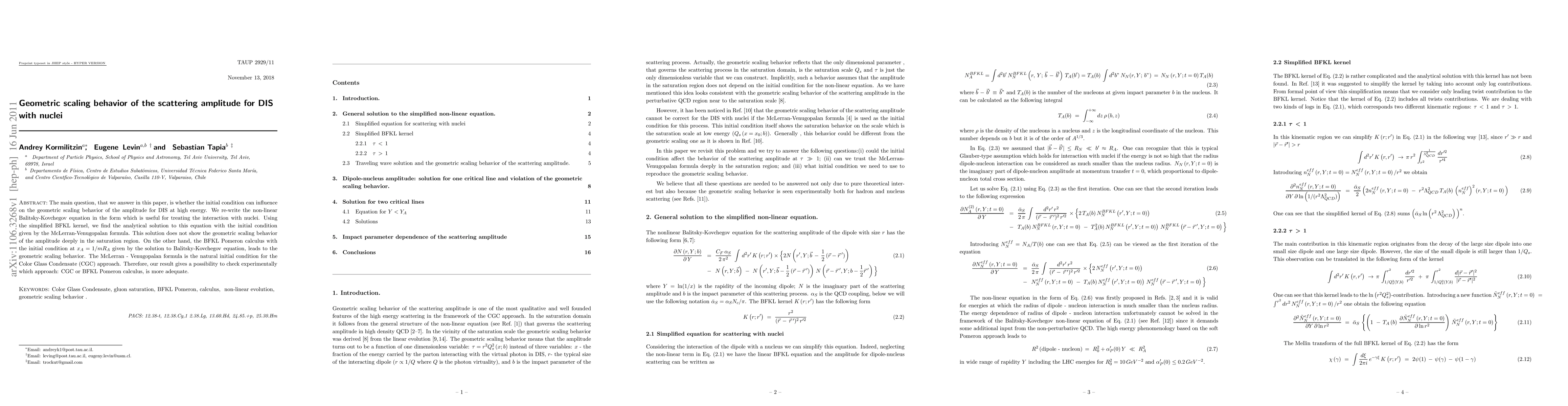 This paper investigates whether the initial condition affects the geometric scaling behavior of the scattering amplitude for deep inelastic scattering (DIS) with nuclei. It finds that the McLerran-Venugopalan formula does not exhibit this behavior, while the BFKL Pomeron calculus does, suggesting a potential experimental test between the Color Glass Condensate and BFKL Pomeron calculus approaches.
