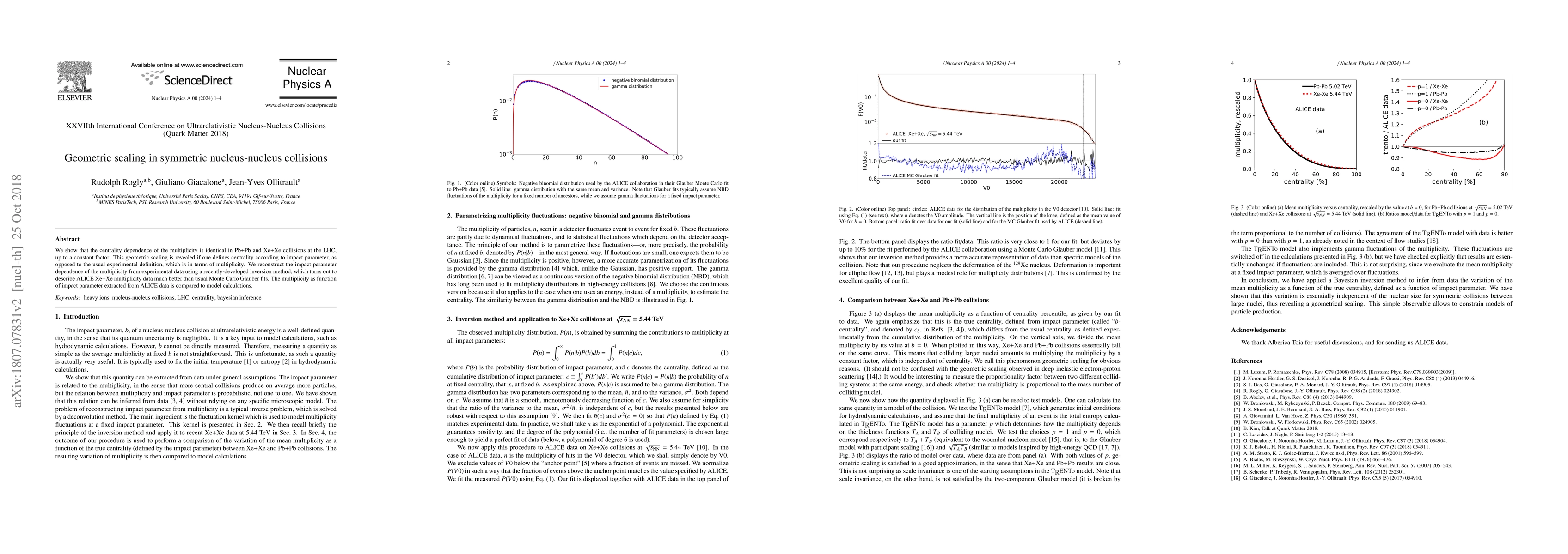 We show that the centrality dependence of the multiplicity is identical in Pb+Pb and Xe+Xe collisions at the LHC, up to a constant factor. This geometric scaling is revealed if one defines centrality according to impact parameter, as opposed to the usual experimental definition, which is in terms of multiplicity. We reconstruct the impact parameter dependence of the multiplicity from experimental data using a recently-developed inversion method, which turns out to describe ALICE Xe+Xe multiplicity data much better than usual Monte Carlo Glauber fits. The multiplicity as function of impact parameter extracted from ALICE data is compared to model calculations.