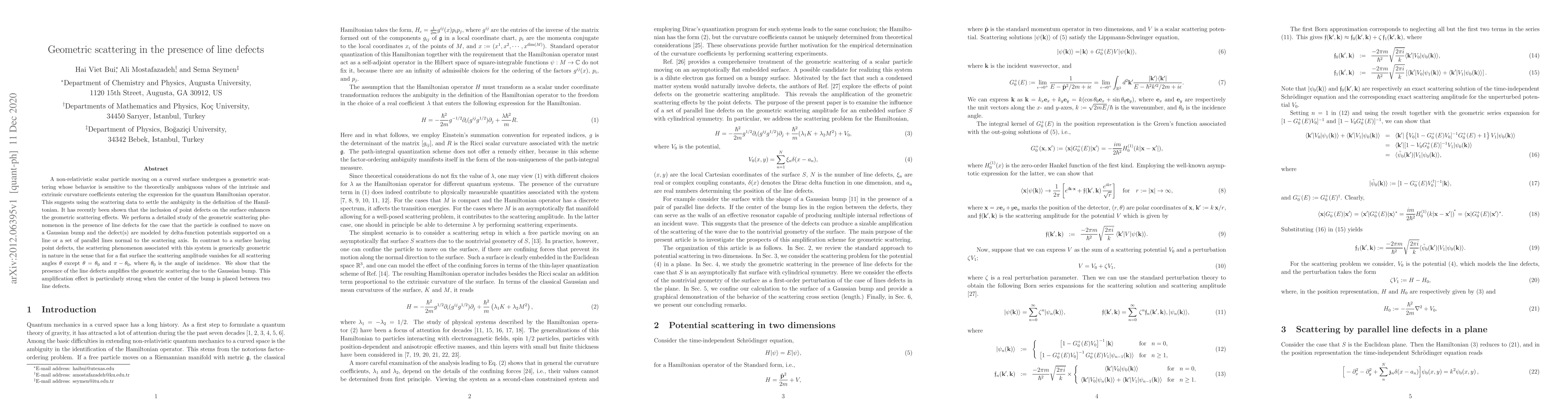 A non-relativistic scalar particle moving on a curved surface undergoes a geometric scattering whose behavior is sensitive to the theoretically ambiguous values of the intrinsic and extrinsic curvature coefficients entering the expression for the quantum Hamiltonian operator. This suggests using the scattering data to settle the ambiguity in the definition of the Hamiltonian. It has recently been shown that the inclusion of point defects on the surface enhances the geometric scattering effects. We perform a detailed study of the geometric scattering phenomenon in the presence of line defects for the case that the particle is confined to move on a Gaussian bump and the defect(s) are modeled by delta-function potentials supported on a line or a set of parallel lines normal to the scattering axis. In contrast to a surface having point defects, the scattering phenomenon associated with this system is generically geometric in nature in the sense that for a flat surface the scattering amplitude vanishes for all scattering angles $\theta$ except $\theta=\theta_0$ and $\pi-\theta_0$, where $\theta_0$ is the angle of incidence. We show that the presence of the line defects amplifies the geometric scattering due to the Gaussian bump. This amplification effect is particularly strong when the center of the bump is placed between two line defects.