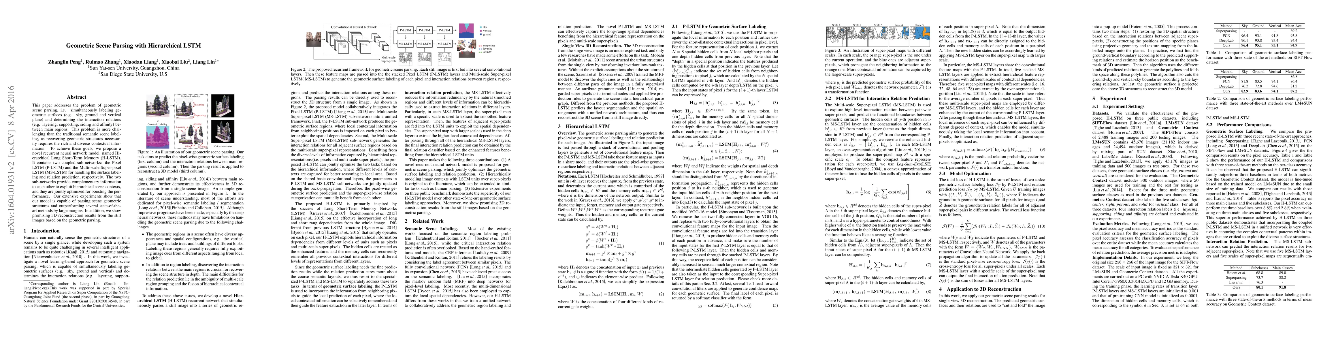 This paper introduces a Hierarchical Long Short-Term Memory (H-LSTM) model for geometric scene parsing, using two coupled sub-networks to label surfaces and predict interaction relations, achieving superior performance over existing methods and enabling 3D reconstruction from images.