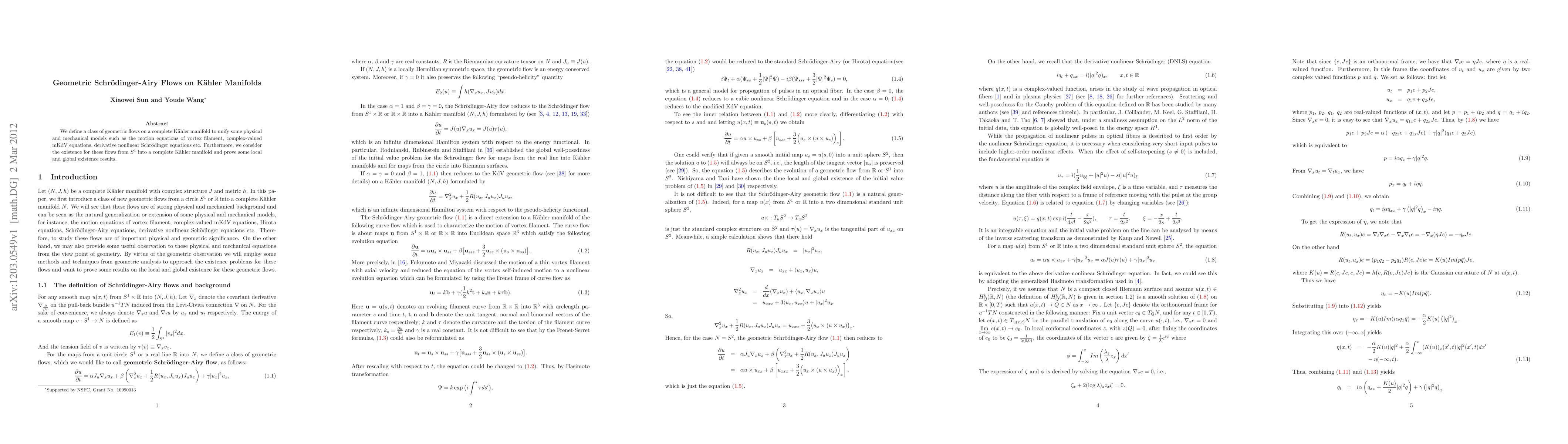 This paper introduces a class of geometric flows on complete Kähler manifolds to unify various physical and mechanical models, including vortex filament equations and derivative nonlinear Schrödinger equations. It also establishes local and global existence results for these flows originating from $S^1$.