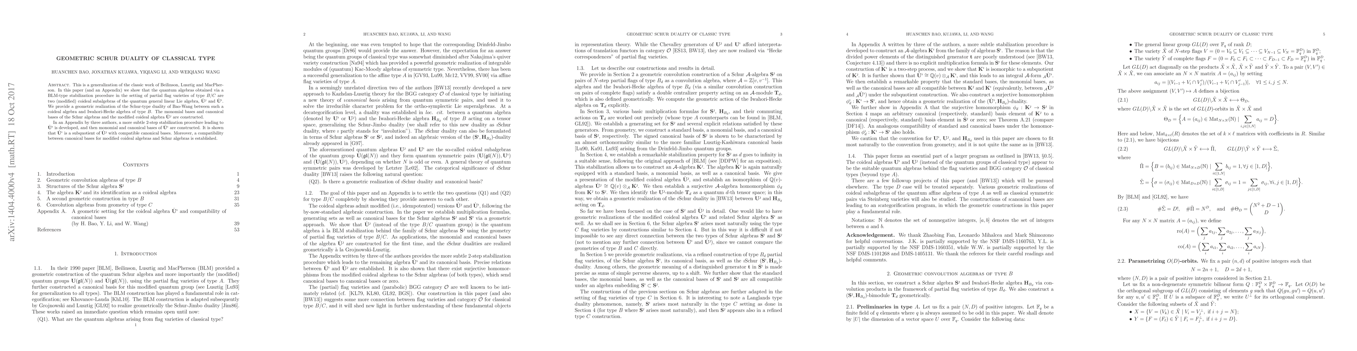 This is a generalization of the classic work of Beilinson, Lusztig and MacPherson. In this paper (and an Appendix) we show that the quantum algebras obtained via a BLM-type stabilization procedure in the setting of partial flag varieties of type $B/C$ are two (modified) coideal subalgebras of the quantum general linear Lie algebra, $\dot{\mathbf U}^{\jmath}$ and $\dot{\mathbf U}^{\imath}$. We provide a geometric realization of the Schur-type duality of Bao-Wang between such a coideal algebra and Iwahori-Hecke algebra of type $B$. The monomial bases and canonical bases of the Schur algebras and the modified coideal algebra $\dot{\mathbf U}^{\jmath}$ are constructed. In an Appendix by three authors, a more subtle $2$-step stabilization procedure leading to $\dot{\mathbf U}^{\imath}$ is developed, and then monomial and canonical bases of $\dot{\mathbf U}^{\imath}$ are constructed. It is shown that $\dot{\mathbf U}^{\imath}$ is a subquotient of $\dot{\mathbf U}^{\jmath}$ with compatible canonical bases. Moreover, a compatibility between canonical bases for modified coideal algebras and Schur algebras is established.