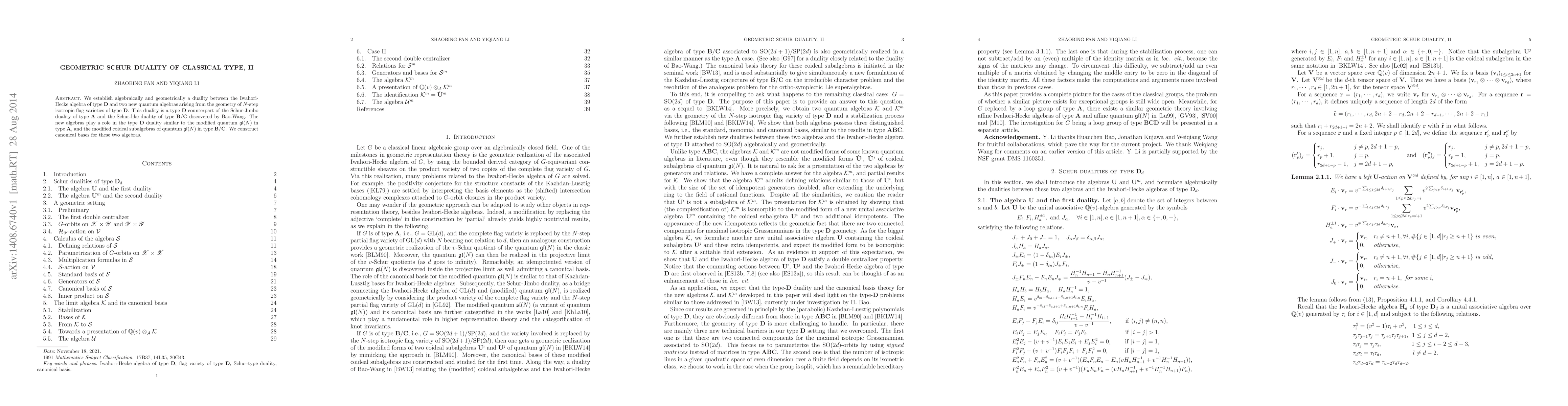 We establish algebraically and geometrically a duality between the Iwahori-Hecke algebra of type D and two new quantum algebras arising from the geometry of N-step isotropic flag varieties of type D. This duality is a type D counterpart of the Schur-Jimbo duality of type A and the Schur-like duality of type B/C discovered by Bao-Wang. The new algebras play a role in the type D duality similar to the modified quantum gl(N) in type A, and the modified coideal subalgebras of quantum gl(N) in type B/C. We construct canonical bases for these two algebras.