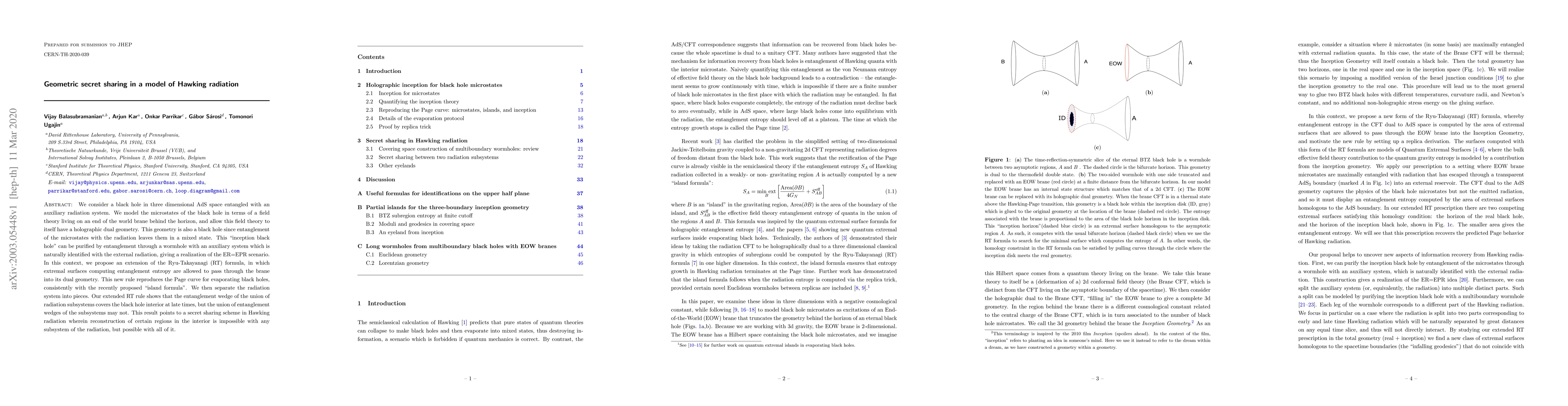 We consider a black hole in three dimensional AdS space entangled with an auxiliary radiation system. We model the microstates of the black hole in terms of a field theory living on an end of the world brane behind the horizon, and allow this field theory to itself have a holographic dual geometry. This geometry is also a black hole since entanglement of the microstates with the radiation leaves them in a mixed state. This "inception black hole" can be purified by entanglement through a wormhole with an auxiliary system which is naturally identified with the external radiation, giving a realization of the ER=EPR scenario. In this context, we propose an extension of the Ryu-Takayanagi (RT) formula, in which extremal surfaces computing entanglement entropy are allowed to pass through the brane into its dual geometry. This new rule reproduces the Page curve for evaporating black holes, consistently with the recently proposed "island formula". We then separate the radiation system into pieces. Our extended RT rule shows that the entanglement wedge of the union of radiation subsystems covers the black hole interior at late times, but the union of entanglement wedges of the subsystems may not. This result points to a secret sharing scheme in Hawking radiation wherein reconstruction of certain regions in the interior is impossible with any subsystem of the radiation, but possible with all of it.