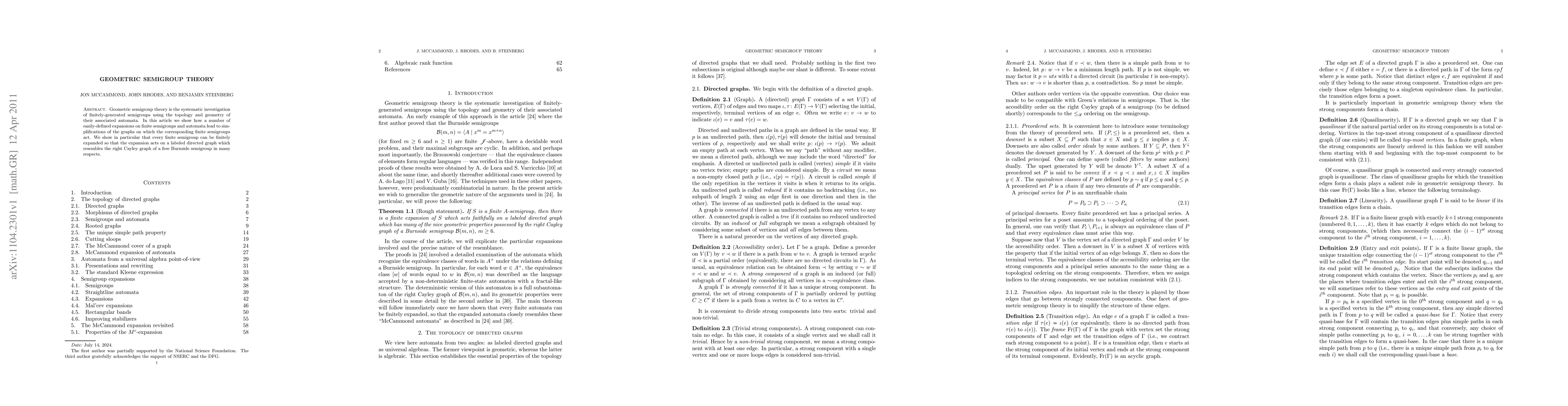 Summary: Geometric semigroup theory explores finitely-generated semigroups through the lens of automata topology and geometry, demonstrating that expansions simplify associated graphs. Every finite semigroup can be expanded to act on a graph resembling the right Cayley graph of a free Burnside semigroup.