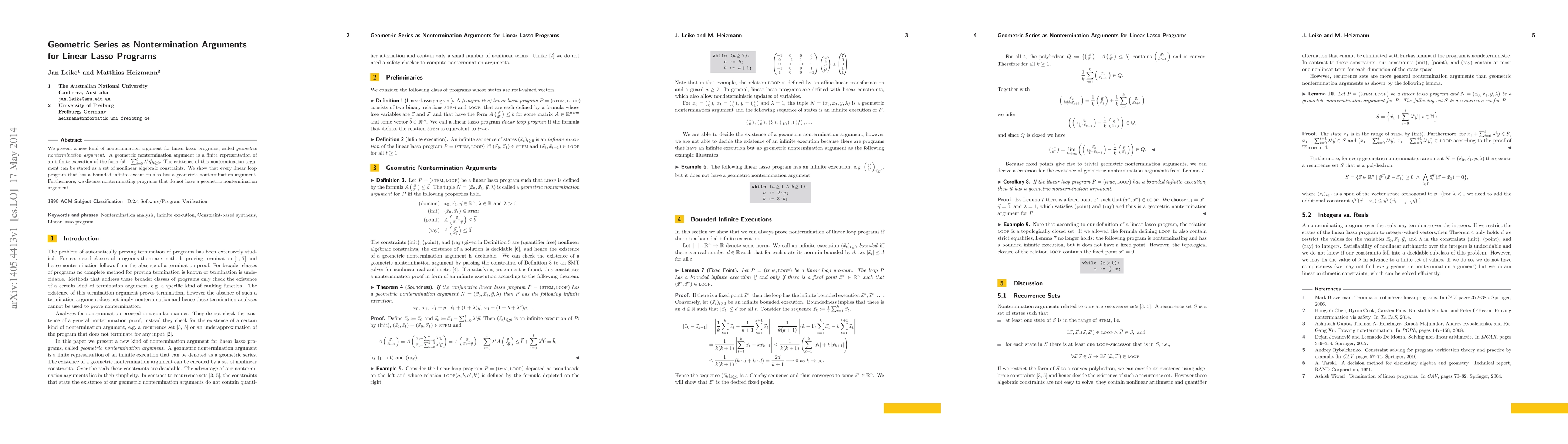 This paper introduces a geometric nontermination argument for linear lasso programs, representing infinite executions as a finite series. It demonstrates that such arguments can be formulated as nonlinear algebraic constraints and proves their existence for bounded infinite executions, while also identifying nonterminating programs lacking this argument.