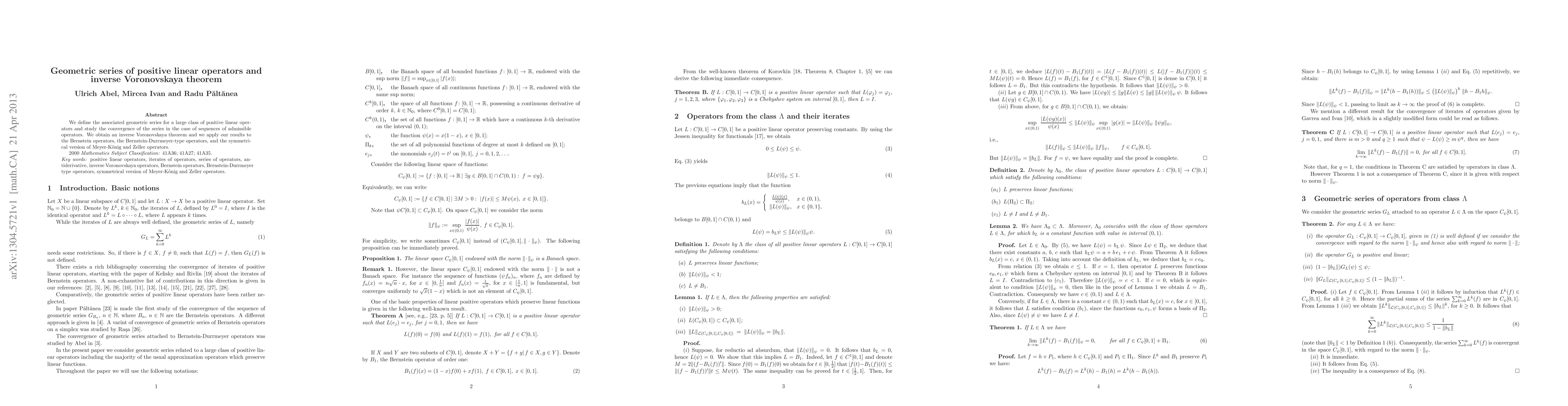 We define the associated geometric series for a large class of positive linear operators and study the convergence of the series in the case of sequences of admissible operators. We obtain an inverse Voronovskaya theorem and we apply our results to the Bernstein operators, the Bernstein-Durrmeyer-type operators, and the symmetrical version of Meyer-K\"onig and Zeller operators.