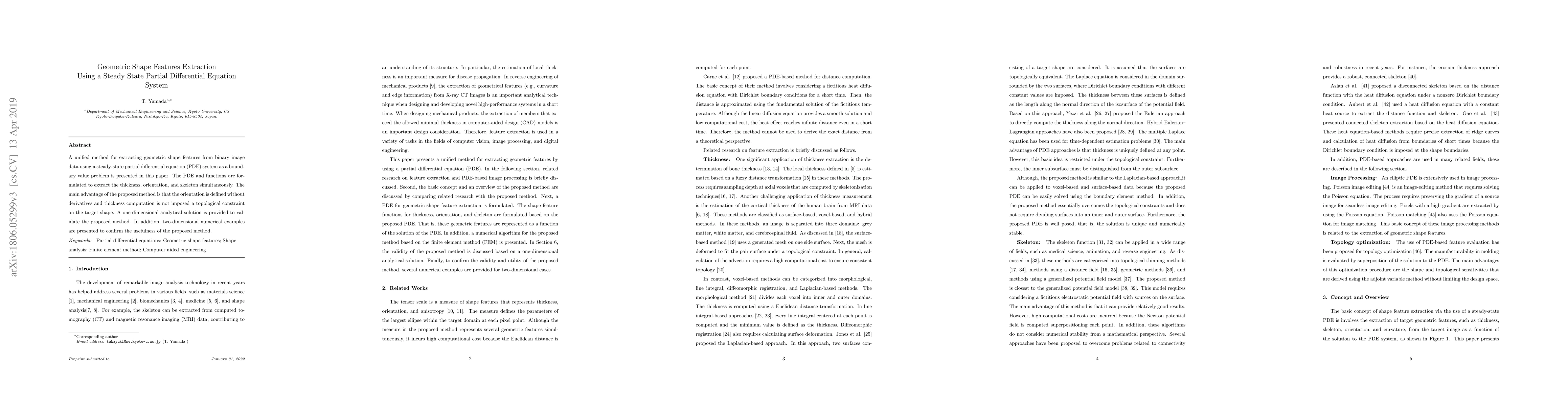 This paper proposes a unified method for extracting geometric shape features from binary images using steady state partial differential equations, allowing simultaneous extraction of thickness, orientation, and skeleton without topological constraints.
