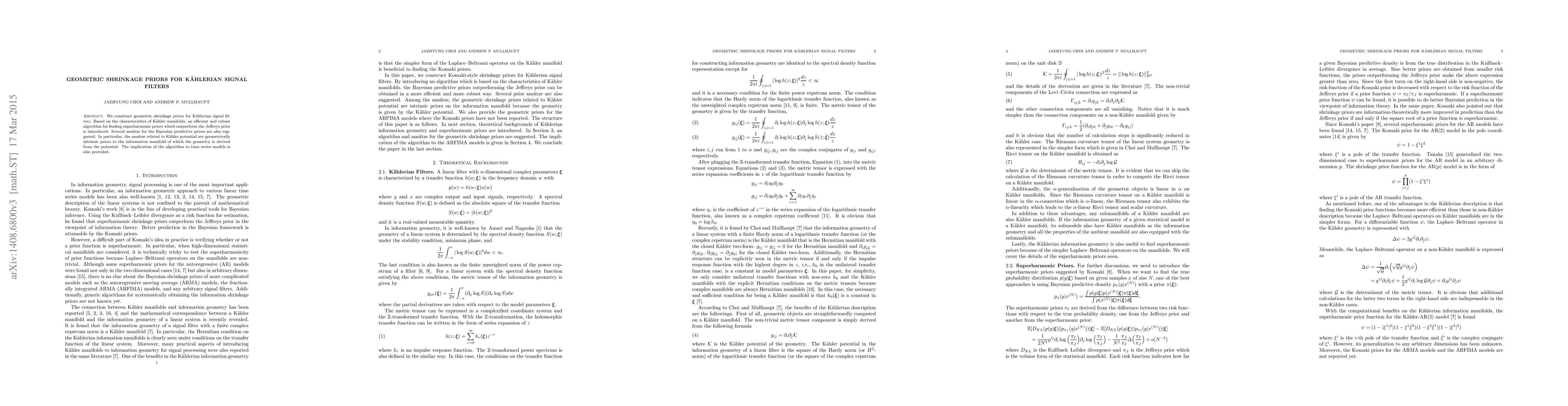 We construct geometric shrinkage priors for K\"ahlerian signal filters. Based on the characteristics of K\"ahler manifolds, an efficient and robust algorithm for finding superharmonic priors which outperform the Jeffreys prior is introduced. Several ans\"atze for the Bayesian predictive priors are also suggested. In particular, the ans\"atze related to K\"ahler potential are geometrically intrinsic priors to the information manifold of which the geometry is derived from the potential. The implication of the algorithm to time series models is also provided.