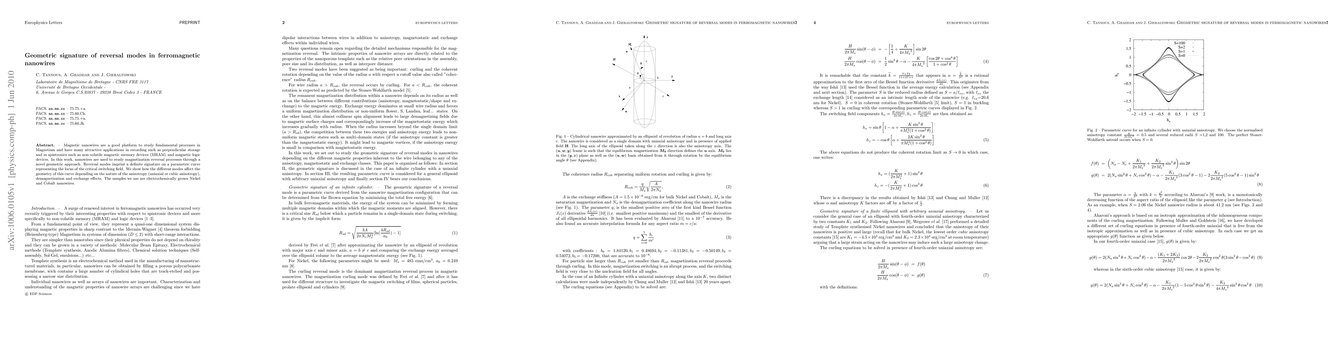 This paper investigates magnetization reversal processes in ferromagnetic nanowires using a geometric approach, revealing distinct signatures on a parametric curve for different reversal modes. The study focuses on Nickel and Cobalt nanowires, highlighting how anisotropy, demagnetization, and exchange effects influence these signatures.