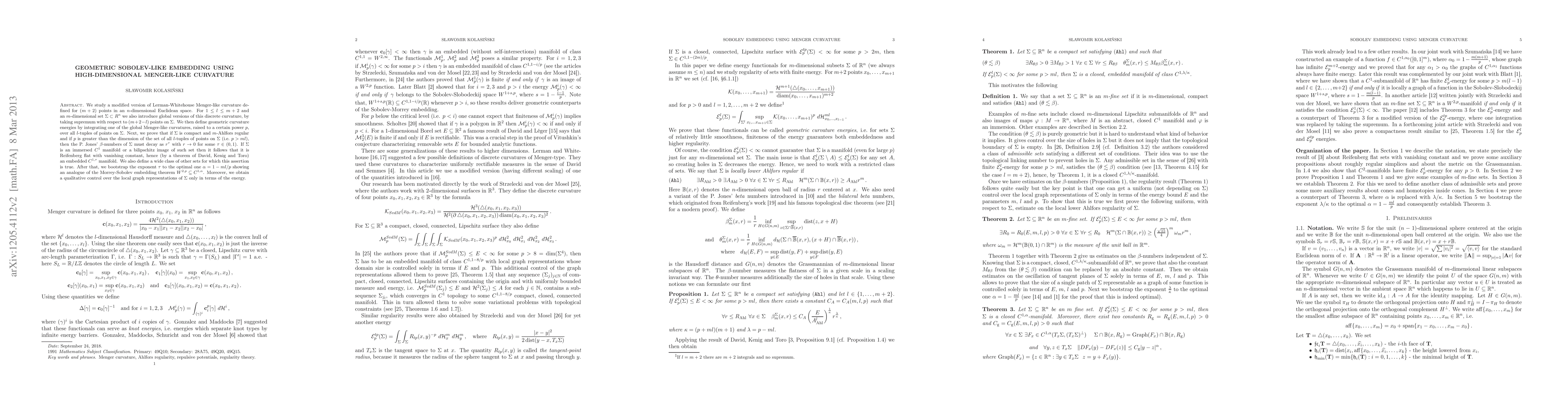 We study a modified version of Lerman-Whitehouse Menger-like curvature defined for m+2 points in an n-dimensional Euclidean space. For 1 <= l <= m+2 and an m-dimensional subset S of R^n we also introduce global versions of this discrete curvature, by taking supremum with respect to m+2-l points on S. We then define geometric curvature energies by integrating one of the global Menger-like curvatures, raised to a certain power p, over all l-tuples of points on S. Next, we prove that if S is compact and m-Ahlfors regular and if p is greater than ml, then the P. Jones' \beta-numbers of S must decay as r^t with r \to 0 for some t in (0,1). If S is an immersed C^1 manifold or a bilipschitz image of such set then it follows that it is Reifenberg flat with vanishing constant, hence (by a theorem of David, Kenig and Toro) an embedded C^{1,t} manifold. We also define a wide class of other sets for which this assertion is true. After that, we bootstrap the exponent t to the optimal one a = 1 - ml/p showing an analogue of the Morrey-Sobolev embedding theorem. Moreover, we obtain a qualitative control over the local graph representations of S only in terms of the energy.