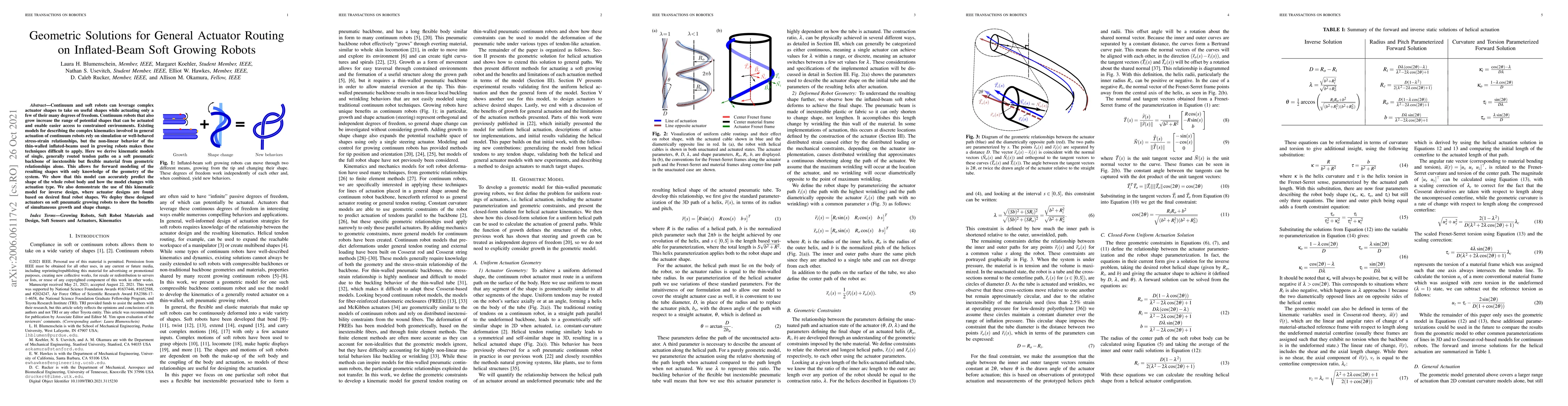 Continuum and soft robots can leverage complex actuator shapes to take on useful shapes while actuating only a few of their many degrees of freedom. Continuum robots that also grow increase the range of potential shapes that can be actuated and enable easier access to constrained environments. Existing models for describing the complex kinematics involved in general actuation of continuum robots rely on simulation or well-behaved stress-strain relationships, but the non-linear behavior of the thin-walled inflated-beams used in growing robots makes these techniques difficult to apply. Here we derive kinematic models of single, generally routed tendon paths on a soft pneumatic backbone of inextensible but flexible material from geometric relationships alone. This allows for forward modeling of the resulting shapes with only knowledge of the geometry of the system. We show that this model can accurately predict the shape of the whole robot body and how the model changes with actuation type. We also demonstrate the use of this kinematic model for inverse design, where actuator designs are found based on desired final robot shapes. We deploy these designed actuators on soft pneumatic growing robots to show the benefits of simultaneous growth and shape change.