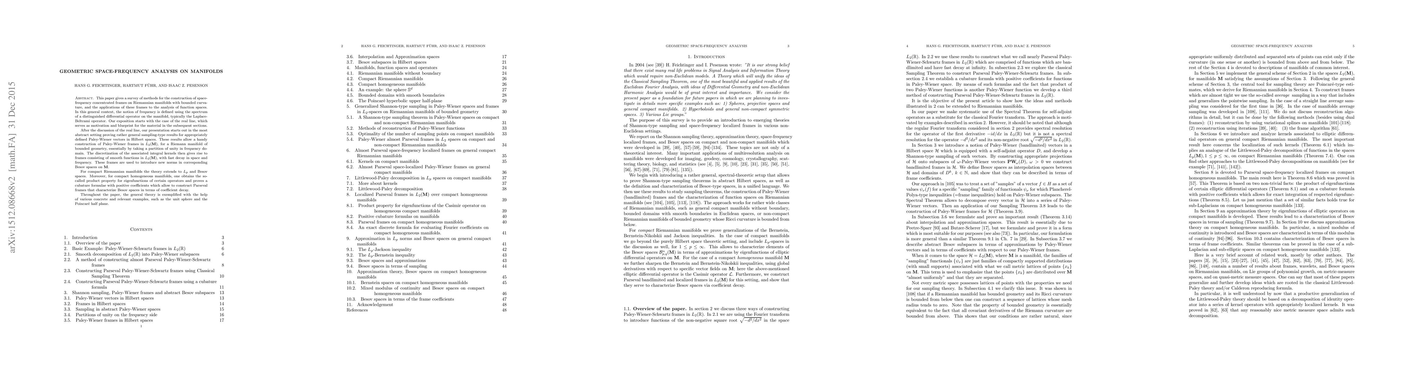 This paper gives a survey of methods for the construction of space-frequency concentrated frames on Riemannian manifolds with bounded curvature, and the applications of these frames to the analysis of function spaces. In this general context, the notion of frequency is defined using the spectrum of a distinguished differential operator on the manifold, typically the Laplace-Beltrami operator. Our exposition starts with the case of the real line, which serves as motivation and blueprint for the material in the subsequent sections. After the discussion of the real line, our presentation starts out in the most abstract setting proving rather general sampling-type results for appropriately defined Paley-Wiener vectors in Hilbert spaces. These results allow a handy construction of Paley-Wiener frames in $L_2(\mfd{M})$, for a Riemann manifold of bounded geometry, essentially by taking a partition of unity in frequency domain. The discretization of the associated integral kernels then gives rise to frames consisting of smooth functions in $L_2(\mfd{M})$, with fast decay in space and frequency. These frames are used to introduce new norms in corresponding Besov spaces on $\mfd{M}$. For compact Riemannian manifolds the theory extends to $L_p$ and Besov spaces. Moreover, for compact homogeneous manifolds, one obtains the so-called product property for eigenfunctions of certain operators and proves a cubature formulae with positive coefficients which allow to construct Parseval frames that characterize Besov spaces in terms of coefficient decay. Throughout the paper, the general theory is exemplified with the help of various concrete and relevant examples, such as the unit sphere and the Poincar\'{e} half plane.