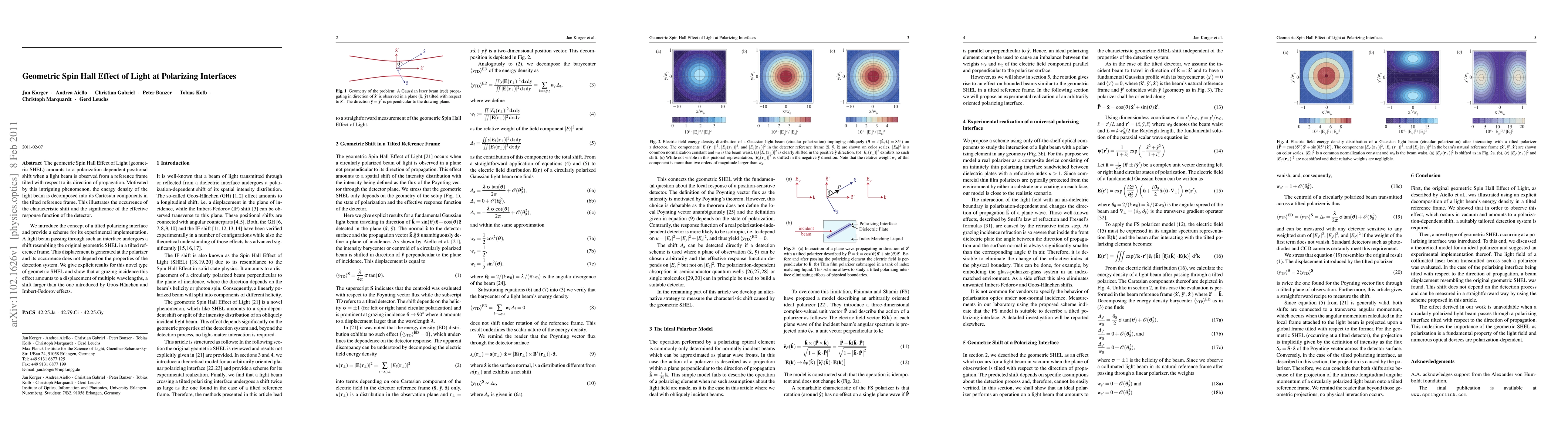 The research explores the geometric Spin Hall Effect of Light (SHEL) at polarizing interfaces, revealing a polarization-dependent positional shift in a tilted reference frame. The study introduces a scheme for experimental implementation using a tilted polarizing interface, demonstrating a significant displacement of light beams at grazing incidence.