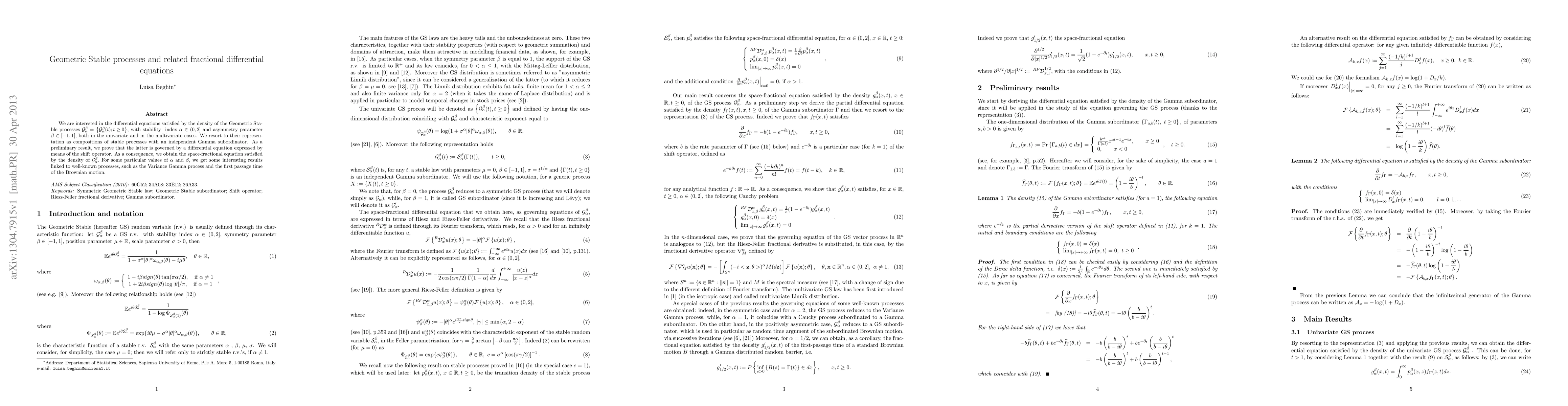 This research paper investigates the differential equations governing the density of Geometric Stable processes, which are represented as compositions of stable processes with an independent Gamma subordinator. The study yields space-fractional equations for the density and interesting results linked to well-known processes such as Variance Gamma process and Brownian motion's first passage time.