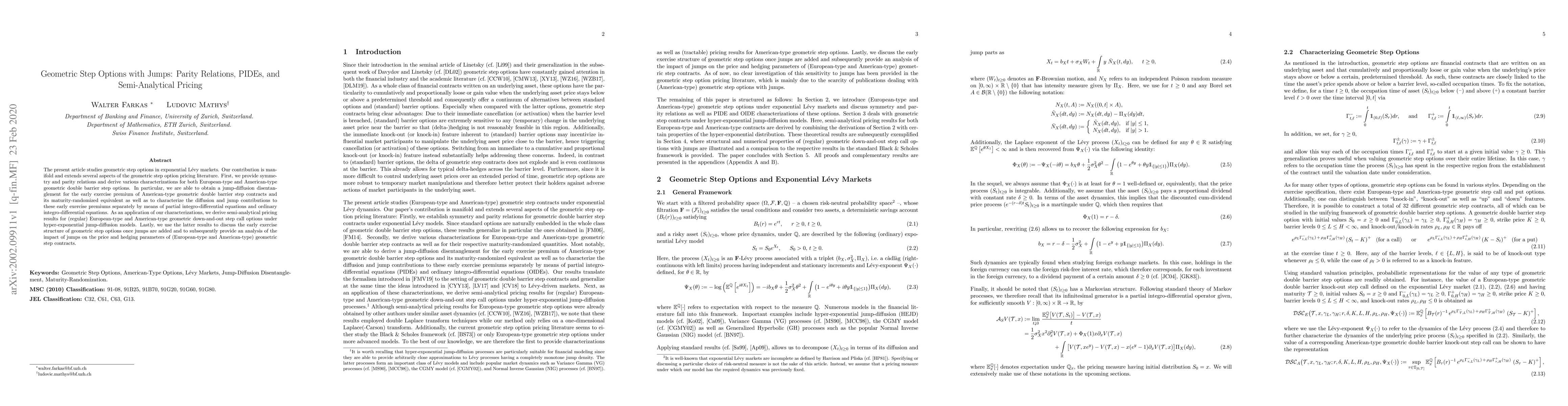 The present article studies geometric step options in exponential L\'evy markets. Our contribution is manifold and extends several aspects of the geometric step option pricing literature. First, we provide symmetry and parity relations and derive various characterizations for both European-type and American-type geometric double barrier step options. In particular, we are able to obtain a jump-diffusion disentanglement for the early exercise premium of American-type geometric double barrier step contracts and its maturity-randomized equivalent as well as to characterize the diffusion and jump contributions to these early exercise premiums separately by means of partial integro-differential equations and ordinary integro-differential equations. As an application of our characterizations, we derive semi-analytical pricing results for (regular) European-type and American-type geometric down-and-out step call options under hyper-exponential jump-diffusion models. Lastly, we use the latter results to discuss the early exercise structure of geometric step options once jumps are added and to subsequently provide an analysis of the impact of jumps on the price and hedging parameters of (European-type and American-type) geometric step contracts.
