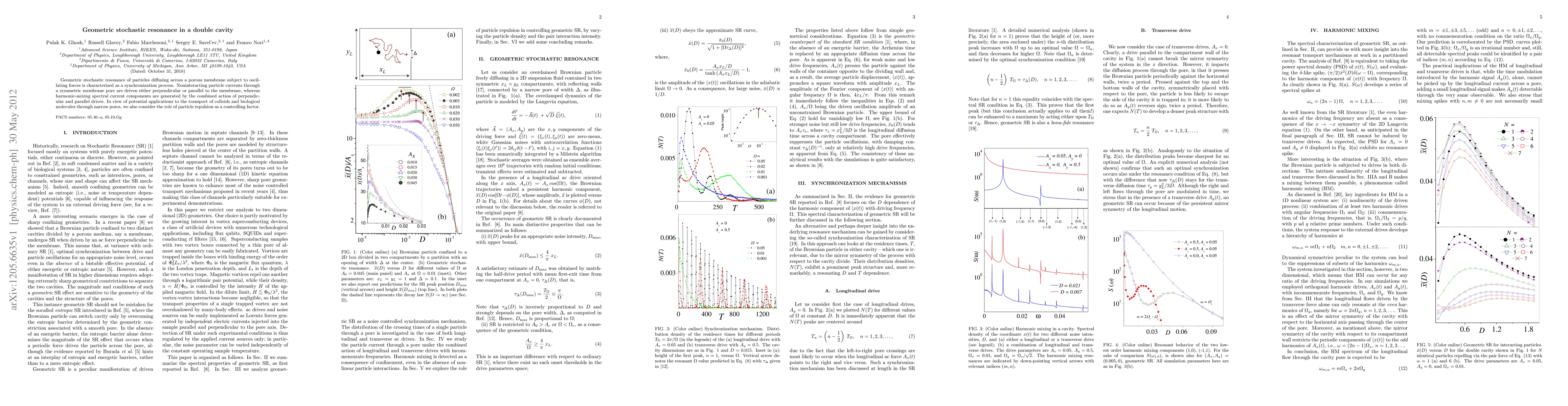 Geometric stochastic resonance of particles diffusing across a porous membrane subject to oscillating forces is characterized as a synchronization process. Noninteracting particle currents through a symmetric membrane pore are driven either perpendicular or parallel to the membrane, whereas harmonic-mixing spectral current components are generated by the combined action of perpendicular and parallel drives. In view of potential applications to the transport of colloids and biological molecules through narrow pores, we also consider the role of particle repulsion as a controlling factor.