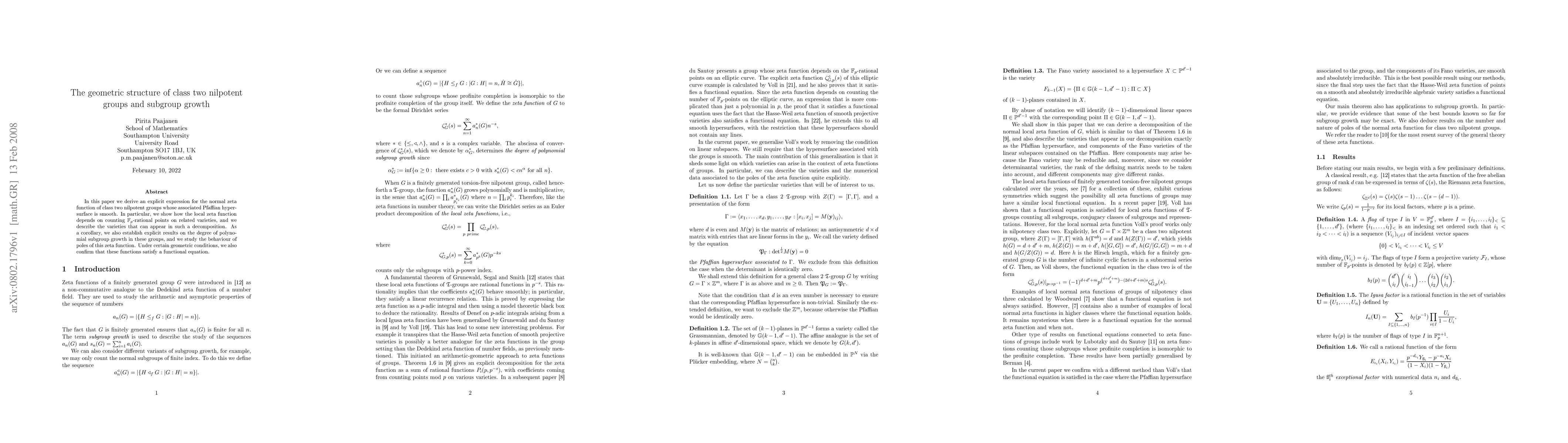 In this paper we derive an explicit expression for the normal zeta function of class two nilpotent groups whose associated Pfaffian hypersurface is smooth. In particular, we show how the local zeta function depends on counting mod p rational points on related varieties, and we describe the varieties that can appear in such a decomposition. As a corollary, we also establish explicit results on the degree of polynomial subgroup growth in these groups, and we study the behaviour of poles of this zeta function. Under certain geometric conditions, we also confirm that these functions satisfy a functional equation.