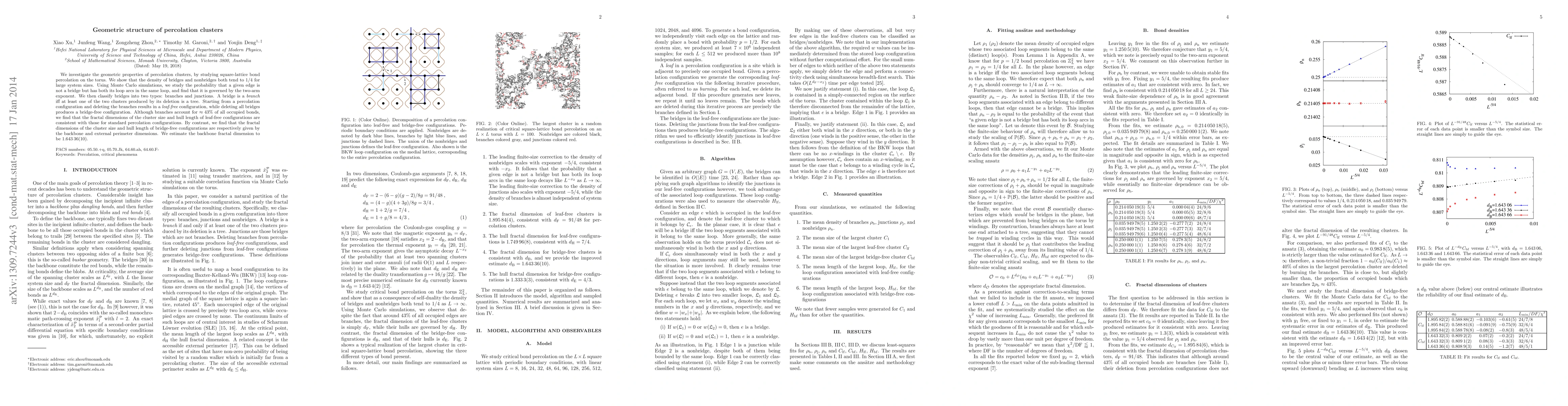 This research paper analyzes geometric properties of percolation clusters using square-lattice bond percolation on a torus. Key findings include bridge and non-bridge densities approaching 1/4 for large systems, classification of bridges into branches and junctions, and distinct fractal dimensions for leaf-free and bridge-free configurations. Monte Carlo simulations were employed to study edge properties and two-arm exponent influence.