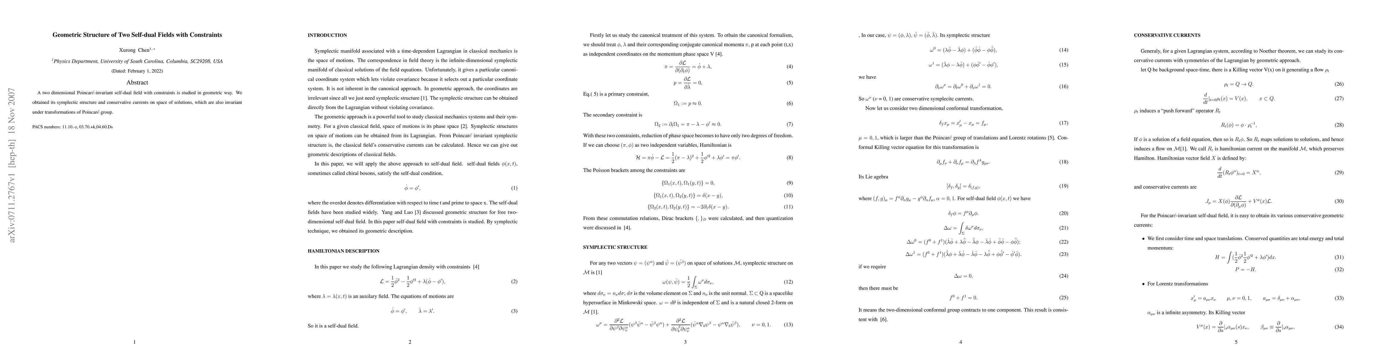 A two dimensional Poincar$\acute{e}$-invariant self-dual field with constraints is studied in geometric way. We obtained its symplectic structure and conservative currents on space of solutions, which are also invariant under transformations of Poincar$\acute{e}$ group.
