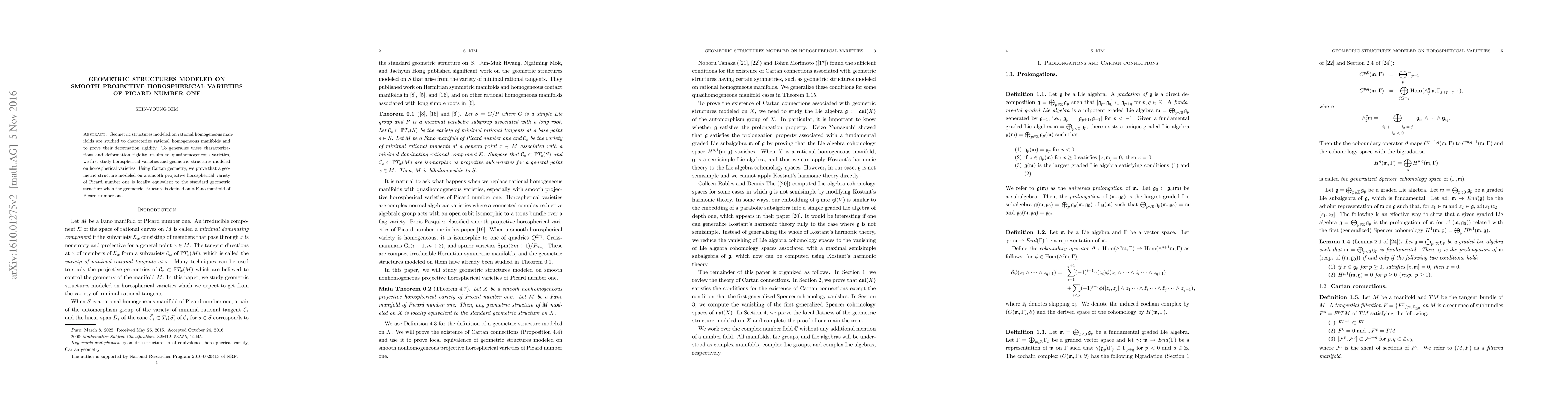Geometric structures modeled on rational homogeneous manifolds are studied to characterize rational homogeneous manifolds and to prove their deformation rigidity. To generalize these characterizations and deformation rigidity results to quasihomogeneous varieties, we first study horospherical varieties and geometric structures modeled on horospherical varieties. Using Cartan geometry, we prove that a geometric structure modeled on a smooth projective horospherical variety of Picard number one is locally equivalent to the standard geometric structure when the geometric structure is defined on a Fano manifold of Picard number one.