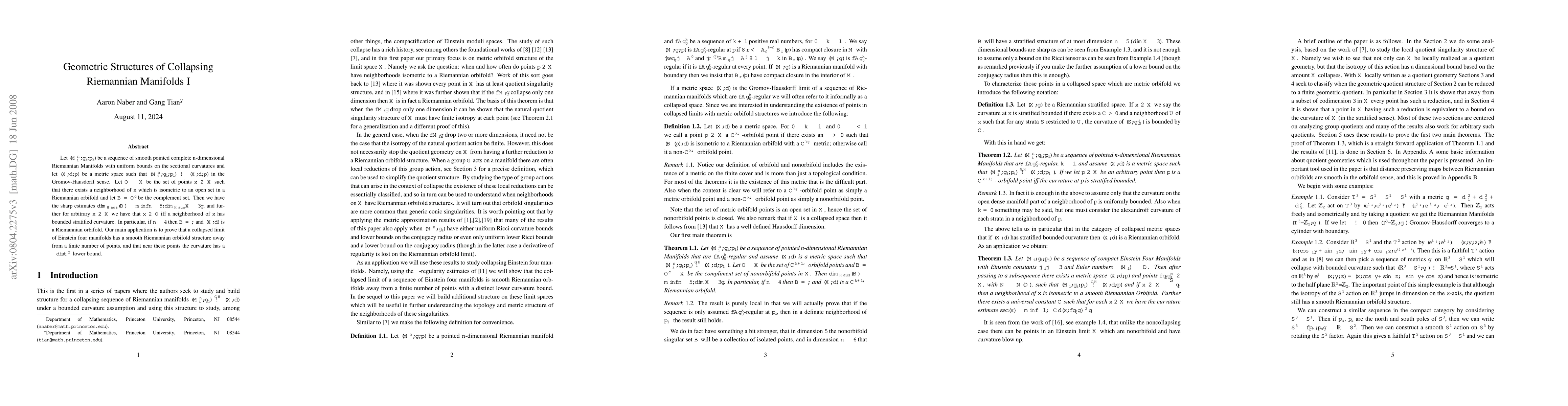 Let (M^n_i,g_i,p_i) be a sequence of smooth pointed complete n-dimensional Riemannian Manifolds with uniform bounds on the sectional curvatures and let (X,d,p) be a metric space such that (M^n_i,g_i,p_i) -> (X,d,p) in the Gromov-Hausdorff sense. Let O \subseteq X be the set of points x \in X such that there exists a neighborhood of x which is isometric to an open set in a Riemannian orbifold and let B = O^c be the complement set. Then we have the sharp estimates dim_Haus(B) \leq min{n-5, dim_Haus(X)-3}, and further for arbitrary x \in X we have that x \in O iff a neighborhood of x has bounded Alexandroff curvature. In particular, if n \leq 4 then B is empty and (X,d) is a Riemannian orbifold. Our main application is to prove that a collapsed limit of Einstein four manifolds has a smooth Riemannian orbifold structure away from a finite number of points, and that near these points the curvatures has a -dist^{-2} lower bound.