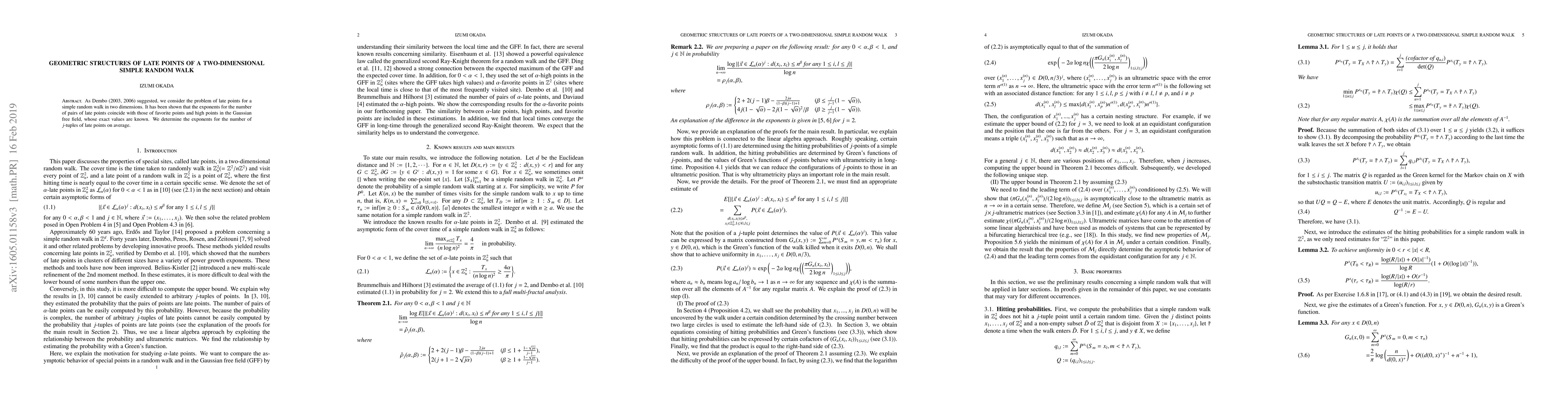 This paper investigates the geometric structures of late points in a two-dimensional simple random walk, showing that their exponents align with those of nearly favorite points and high points in the Gaussian free field. Despite observed similarities among late points, favorite points, and high points, the study reveals a distinct difference in the exponents for multipoint sets of late points.