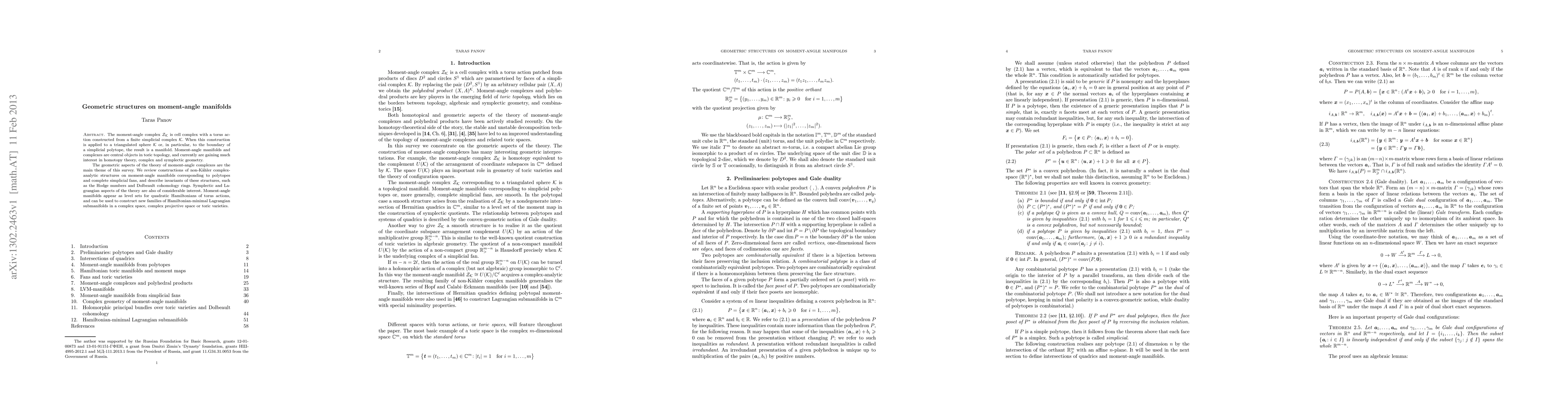 This paper surveys geometric structures on moment-angle manifolds, particularly focusing on non-Kähler complex-analytic structures arising from polytopes and simplicial fans. It also examines symplectic and Lagrangian aspects, including the construction of Hamiltonian-minimal Lagrangian submanifolds.