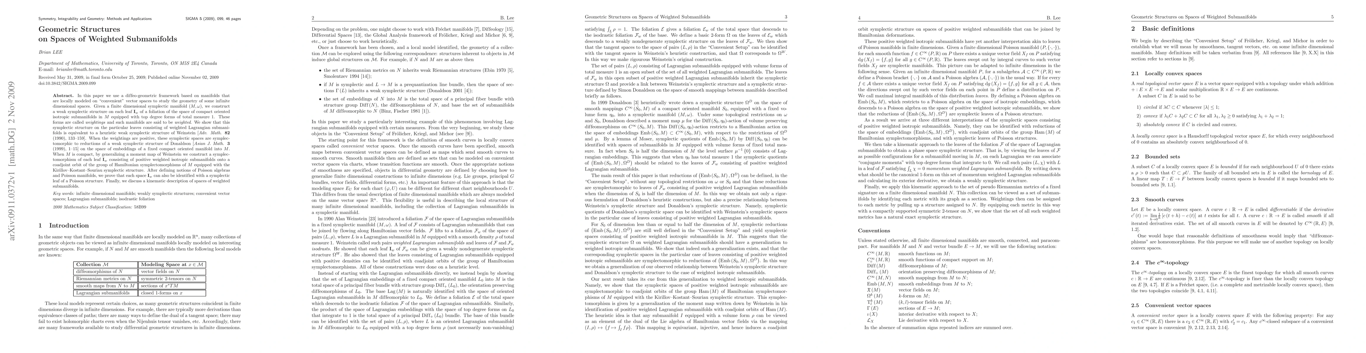 In this paper we use a diffeo-geometric framework based on manifolds that are locally modeled on "convenient" vector spaces to study the geometry of some infinite dimensional spaces. Given a finite dimensional symplectic manifold $(M,\omega)$, we construct a weak symplectic structure on each leaf ${\textbf I}_{w}$ of a foliation of the space of compact oriented isotropic submanifolds in $M$ equipped with top degree forms of total measure 1. These forms are called weightings and such manifolds are said to be weighted. We show that this symplectic structure on the particular leaves consisting of weighted Lagrangian submanifolds is equivalent to a heuristic weak symplectic structure of Weinstein [Adv. Math. 82 (1990), 133-159]. When the weightings are positive, these symplectic spaces are symplectomorphic to reductions of a weak symplectic structure of Donaldson [Asian J. Math. 3 (1999), 1-15] on the space of embeddings of a fixed compact oriented manifold into $M$. When $M$ is compact, by generalizing a moment map of Weinstein we construct a symplectomorphism of each leaf ${\textbf I}_{w}$ consisting of positive weighted isotropic submanifolds onto a coadjoint orbit of the group of Hamiltonian symplectomorphisms of $M$ equipped with the Kirillov-Kostant-Souriau symplectic structure. After defining notions of Poisson algebras and Poisson manifolds, we prove that each space ${\textbf I}_{w}$ can also be identified with a symplectic leaf of a Poisson structure. Finally, we discuss a kinematic description of spaces of weighted submanifolds.