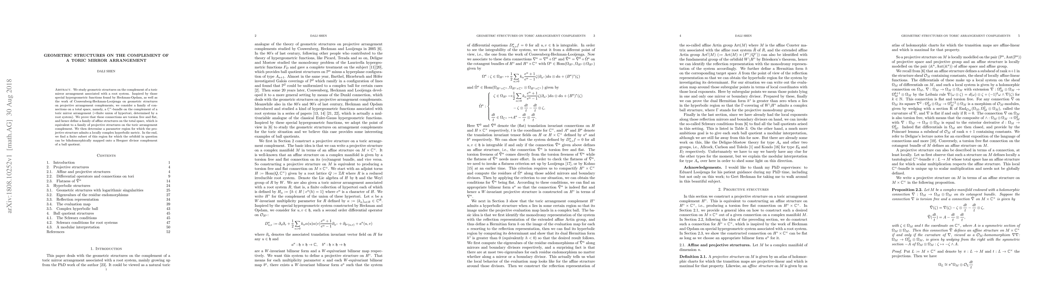 This paper explores geometric structures on the complement of a toric mirror arrangement, proving that certain connections are torsion-free and flat, defining affine and projective structures, and identifying a region where a locally complex hyperbolic metric exists, culminating in a biholomorphic mapping to a Heegner divisor complement.