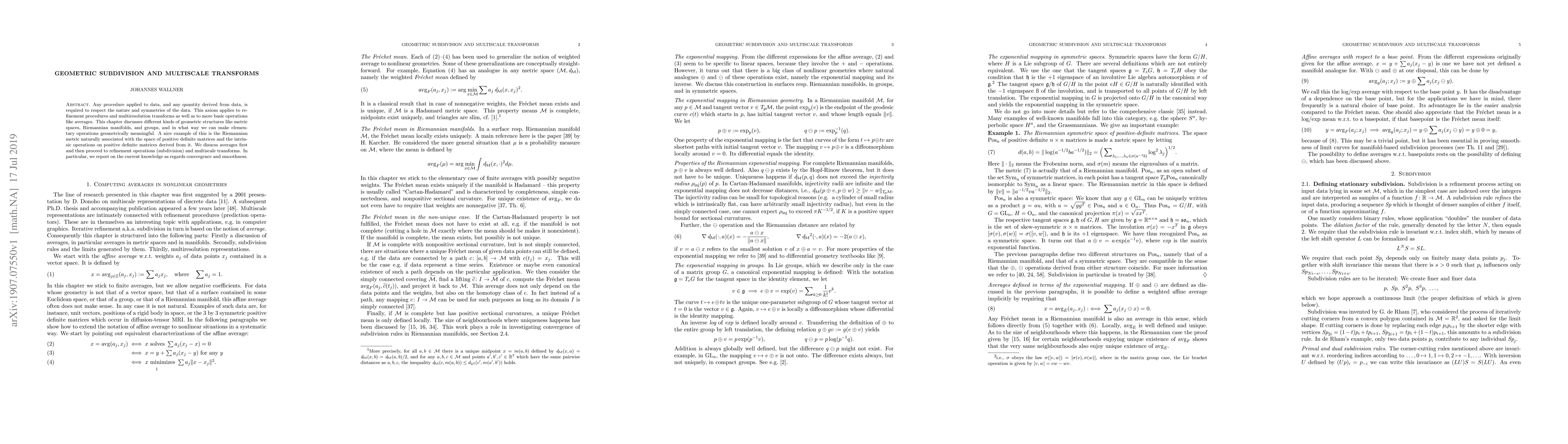This paper discusses how to make mathematical operations like averaging and subdivision meaningful on geometric data structures, ensuring respect for the data's nature and symmetries. It reports on current knowledge of convergence and smoothness in these operations.