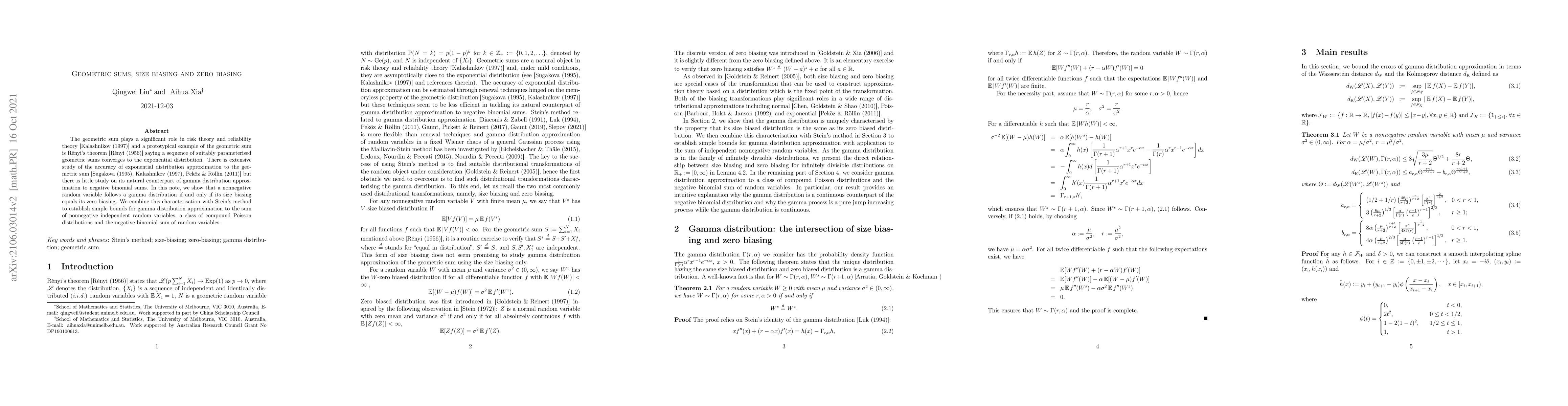 The geometric sum plays a significant role in risk theory and reliability theory \cite{Kala97} and a prototypical example of the geometric sum is R\'enyi's theorem~\cite{Renyi56} saying a sequence of suitably parameterised geometric sums converges to the exponential distribution. There is extensive study of the accuracy of exponential distribution approximation to the geometric sum \cite{Sugakova95,Kala97,PekozRollin11} but there is little study on its natural counterpart of gamma distribution approximation to negative binomial sums. In this note, we show that a nonnegative random variable follows a gamma distribution if and only if its size biasing equals its zero biasing. We combine this characterisation with Stein's method to establish simple bounds for gamma distribution approximation to the sum of nonnegative independent random variables, a class of compound Poisson distributions and the negative binomial sum of random variables.