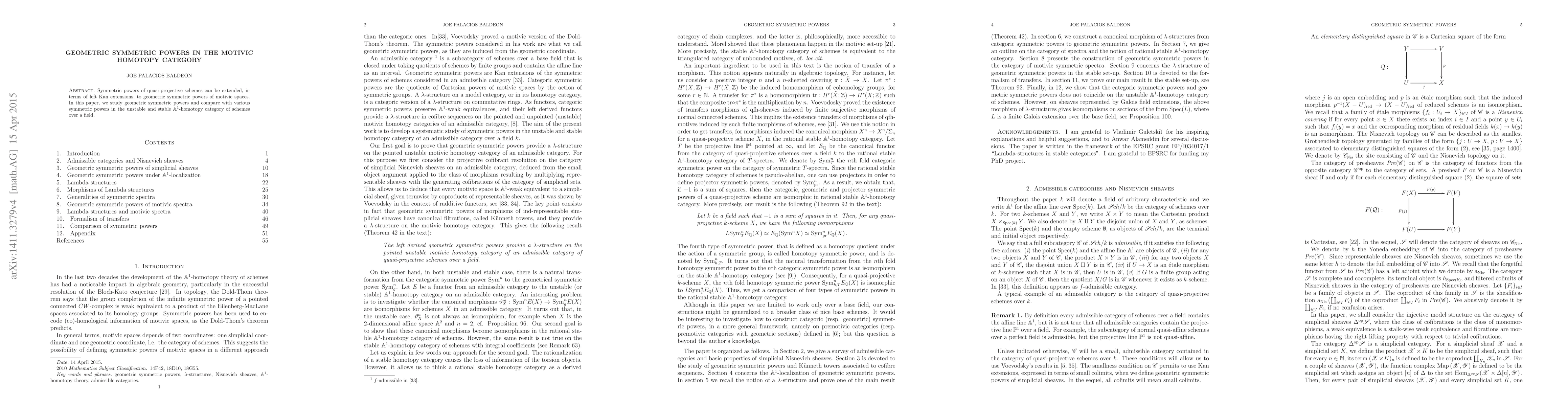 The paper extends symmetric powers from quasi-projective schemes to motivic spaces via left Kan extensions, comparing these geometric symmetric powers with symmetric powers in the unstable and stable motivic homotopy category of schemes over a field.